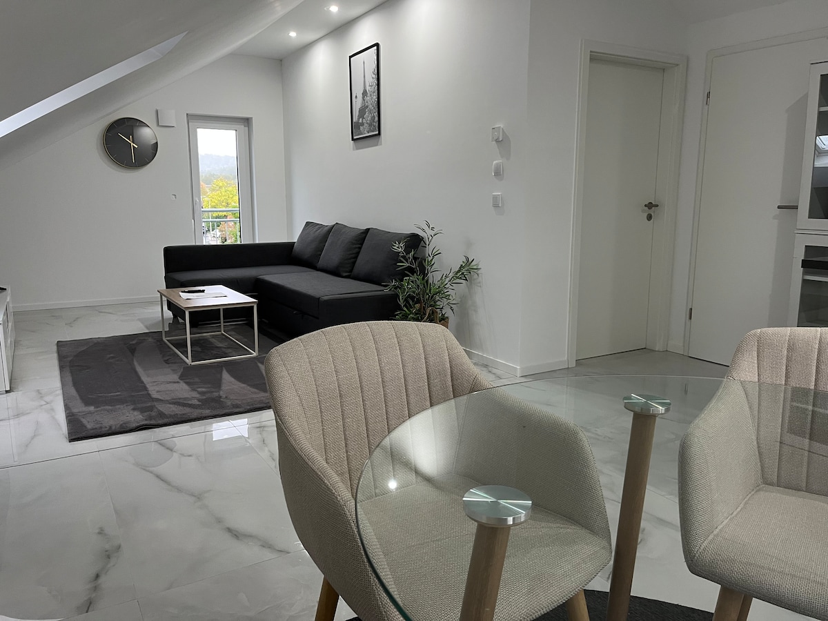 यह अपार्टमेंट शहर के शानदार नज़ारे के साथ एस्लिंगेन की आधी ऊँचाई की लोकेशन पर स्थित है। खेल के मैदान की शांत लोकेशन आराम से रहने की गारंटी देती है। आरामदायक लिविंग - डाइनिंग रूम आपको ठहरने के लिए आमंत्रित करता है और विशाल बेडरूम आरामदायक आराम की गारंटी देता है। रसोई आधुनिक और पूरी तरह से सुसज्जित है और बाथरूम उज्ज्वल और आधुनिक है। दो छोटी छतें उपलब्ध हैं और आपको दिन के अंत में सूर्यास्त के लिए आमंत्रित करती हैं।
