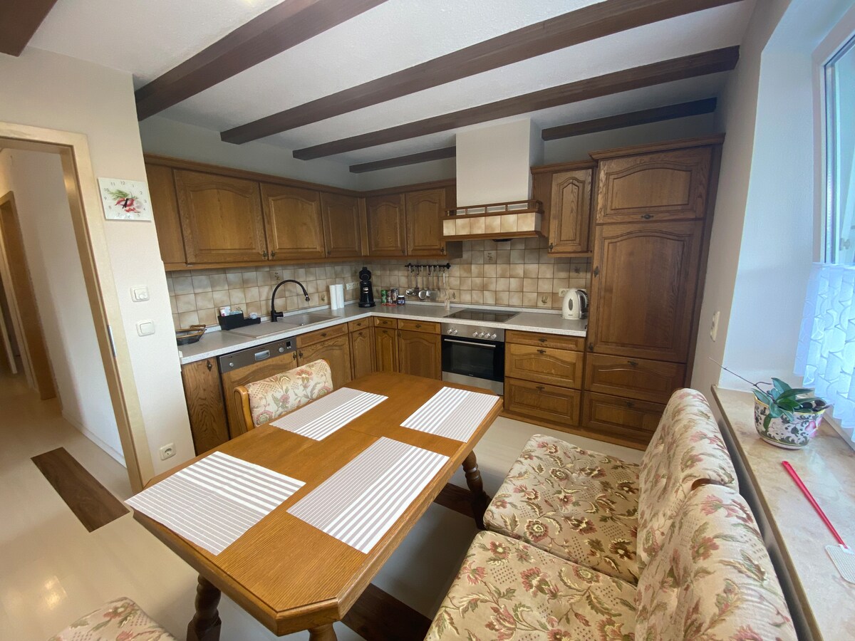 रोमांटिक सड़क से बहुत दूर नहीं, आप बाहरी इलाके में एक पूर्व फ़ार्म पर बहुत चुपचाप हमारे साथ रहेंगे। नया रेनोवेट किया गया अपार्टमेंट ग्राउंड फ़्लोर पर है और एक बड़ी सी छत और बगीचे तक पहुँच है। इसमें 2 बेडरूम हैं, जिनमें से प्रत्येक में काम करने की जगह है, एक लिविंग एरिया है जिसमें आरामदायक सोफ़ा (स्लीपिंग फ़ंक्शन), एक बड़ा डाइनिंग टेबल, पूरी तरह से सुसज्जित किचन और वॉक - इन शॉवर के साथ आधुनिक बाथरूम। आस - पास के बड़े बगीचे में एक पार्टी हट है, जिसमें कैम्प फ़ायर रिंग है।