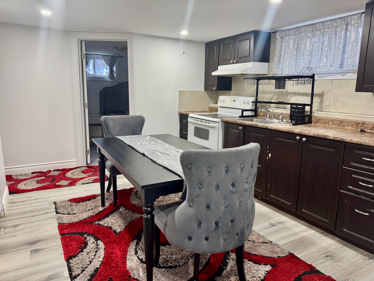 प्राइवेट वॉक आउट बेसमेंट अपार्टमेंट W/अलग प्रवेश द्वार। 420 वर्गफ़ुट की जगह। क्वीन साइज़ बेड। ओवरसाइज़्ड शावर w/रेनफॉल शावर - हेड। माइक्रोवेव, दो मिनी फ़्रिज, कॉफ़ी/हॉट वॉटर टी मेकर। कृपया ध्यान दें: पूरा किचन नहीं। डाइनिंग/वर्क टेबल w/बेंच। हाई स्पीड वाई - फाई। लिविंग रूम w/ Reclining Lazy Boy काउच और 50” स्मार्ट टीवी। 1000 से अधिक लाइव टीवी चैनल और नेटफ्लिक्स। निजी लिटिल बैकयार्ड आँगन w/टेबल। निजी ड्राइववे ( 2 कारें)। 1 मिनट की ड्राइव से Hwy 401 तक। AJAX गो स्टेशन तक 15 मिनट की पैदल दूरी पर।