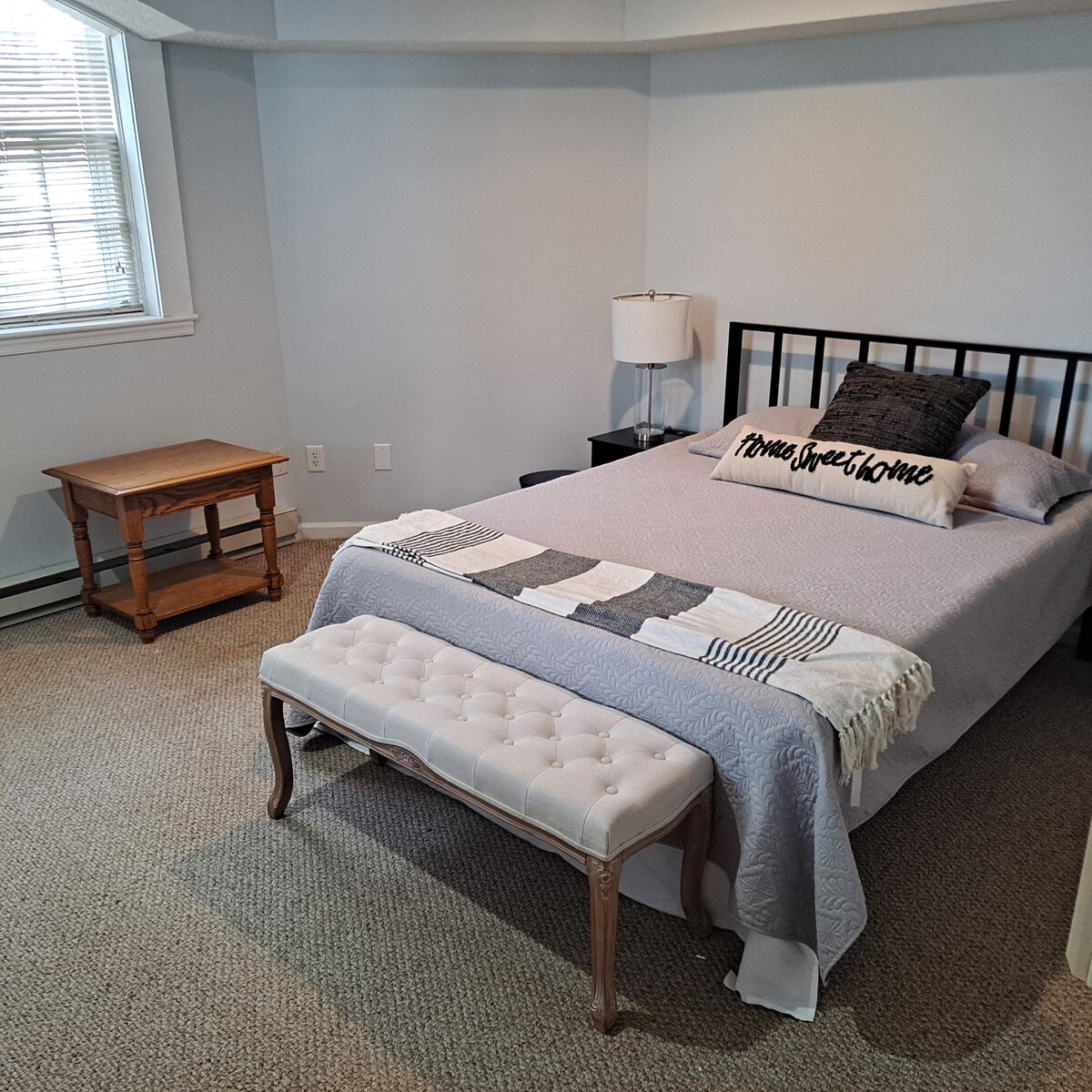 भरपूर रहने की जगह और अलग - अलग मेहमानों के प्रवेशद्वार के साथ हमारे शांतिपूर्ण और निजी बगीचे के अपार्टमेंट में आराम करें (सीढ़ियाँ ज़रूरी हैं)। चार आस - पास के कमरे: 1) क्वीन बेडरूम, 2) ट्रंडल डेबेड (2 जुड़वाँ) वाली बड़ी मांद, 3) गर्म शावर वाला पूरा बाथरूम (कोई टब नहीं), और 4) पूरी तरह से सुसज्जित किचन जिसमें लॉन्ड्री एरिया है। सभी बेड पर 100% कॉटन शीट। वायरलेस इंटरनेट शामिल है।