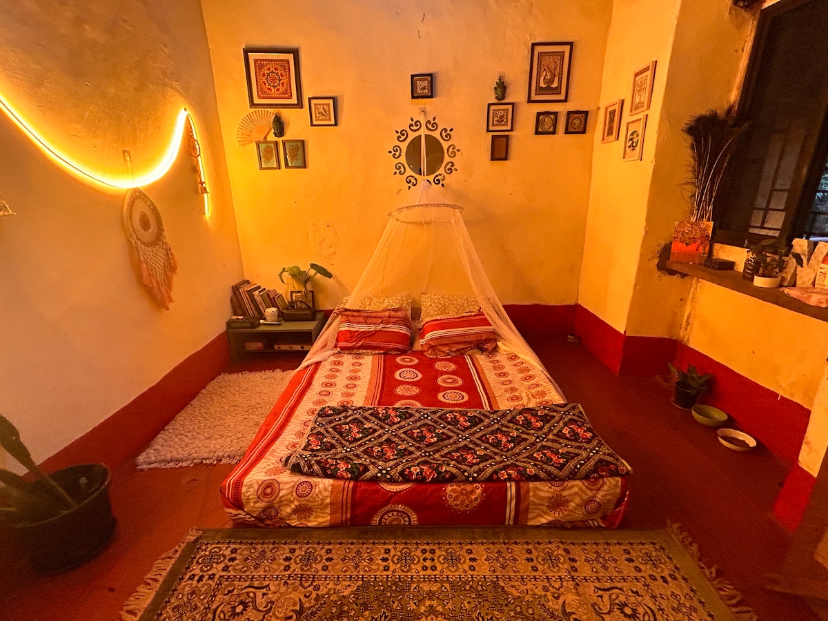 A beautiful boho vibe was front of my mind when creating this stunning cottage. Tucked away in a quite nook, overlooking an organic kitchen garden with the view of the fields, you will be trasported to a bygone era where things were just much slower. When spending time watching the birds & the bees, enjoying leisurely cups of tea, chatting on the balcony was part of the day. Surrounded by trees, you see another side of Goa. Yet you are literally 5 mins away from the party hub of Goa.