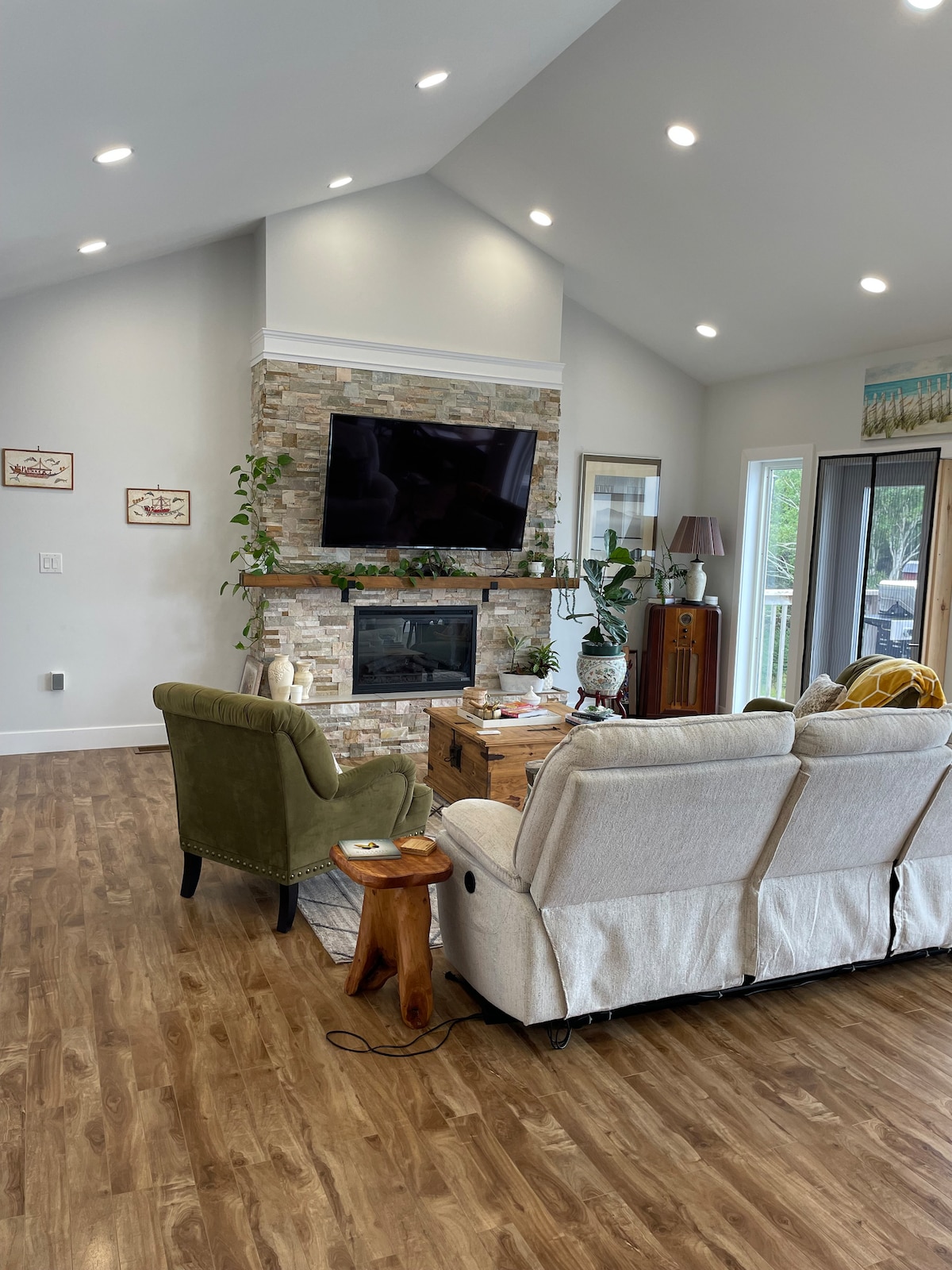छत की खिड़कियों के लिए फर्श के साथ आधुनिक आराम से झील सामने घर आपको अद्भुत वाटरफ़्रंट दृश्य प्रदान करता है। सर्द शाम को गर्म करने के लिए लिविंग रूम में लकड़ी के जलने वाले स्टोव के साथ उज्ज्वल लेआउट खोलें। डिशवॉशर, माइक्रोवेव, ओवन और स्टोव के साथ पूरी तरह से सुसज्जित रसोईघर। मास्टर बेडरूम में संलग्न वॉशरूम के साथ एक राजा आकार का बिस्तर है। दूसरे बेडरूम में क्वीन साइज़ बेड है और तीसरे बेडरूम में 2 ट्विन बेड हैं। बाथटब और शॉवर के साथ एक मुख्य वॉशरूम भी है। हाई स्पीड फाइबर ऑप्टिक इंटरनेट उपलब्ध है।