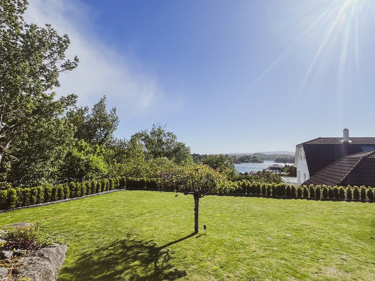 Koselig familiehus et steinkast fra sjøen – med koselig strand, jacuzzi, trampoline, lekehytte og SUP/kajakk til leie! Stor hage med grill og flere terrasser. 4 soverom + TV-stue med sovesofa, 2 bad og åpen stue/kjøkkenløsning med god plass til alle. Butikk 2 min unna, kun 25 min til Bergen sentrum og båtutleie 5 minutter unna. Perfekt for barnefamilier! Vi kan ta imot andre henvendelser om du ikke finner ledig på kalender.