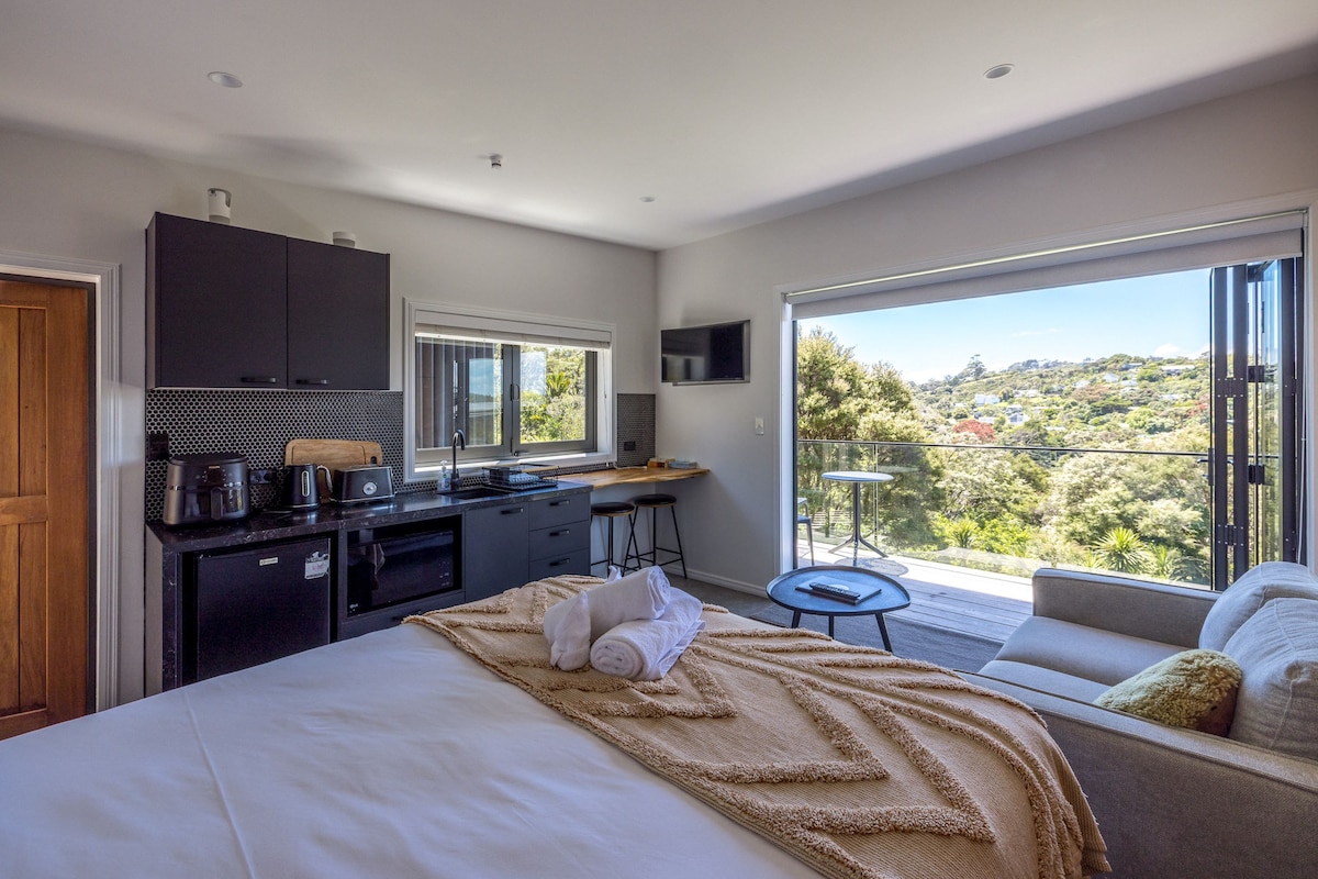 विशाल, धूप से भरा स्टूडियो शैले। फ़्रेंच कंट्री स्टाइल, किंग साइज़ बेड, भव्य बाथरूम, रात में कीवी कॉलिंग सुनें। अलग - अलग किचन, निजी डेक, bbq, स्पा पूल, समुद्र के ऊपर और गरीब नाइट्स द्वीपसमूह के खूबसूरत नज़ारे। पालतू जीवों के लिए अनुकूल, सिर्फ़ x1 छोटा - मध्यम कुत्ता या सिर्फ़ व्यवस्था के आधार पर अतिरिक्त x1। ध्यान देना ज़रूरी है: हमारे पास उस प्रॉपर्टी के ज़रिए वाईफ़ाई की सुविधा उपलब्ध है, जिसका सिग्नल कभी - कभी कमज़ोर/सामान्य होता है। ऐसा हमारी लोकेशन और कभी - कभी खराब मौसम की वजह से होता है