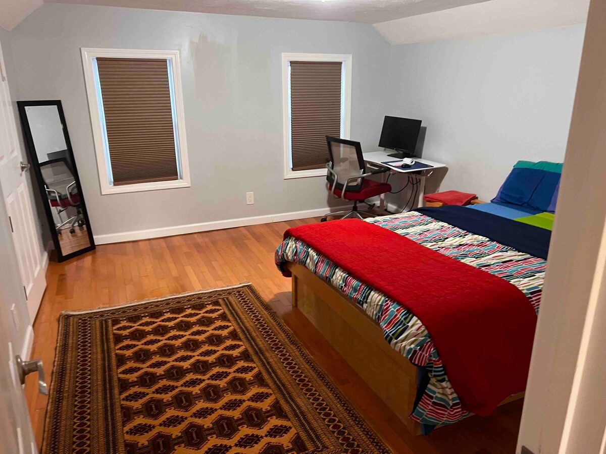 It's a spacious bedroom with hardwood floors, a desk, 55-inch smart TV, and a very comfortable queen-size bed for 2. You would share the newly renovated kitchen and bathroom with other guests in the 1300 sqft apartment. It's only about a 13 mins walk to the Sullivan Square Subway station on the Orange line and takes 10 mins straight into Boston. A quiet neighborhood with tons of restaurants, cafes, and a grocery store that's only one block away. Equipped with high-speed internet.