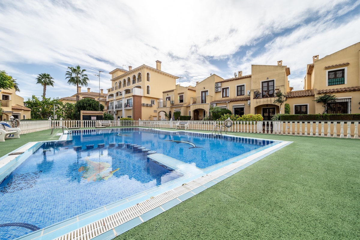 тАЬThe Sunny HouseтАЭ chalet en primera l├нnea de playa en Cabo Roig, ideal para familias. Cuenta con 3 habitaciones y 2 dormitorios , sal├│n con cocina integrada, ba├▒o amplio, jard├нn, aire acondicionado/calefacci├│n, piscina para residentes y parking. Totalmente equipada y a 2 min de la playa, con vistas al mar y cerca de ocio, restaurantes y rutas de senderismo. Capacidad 4 hu├йspedes. Por un quinto hu├йsped se cobra un extra de 50 тВм/noche y se hanilita un tercer dormitorio.