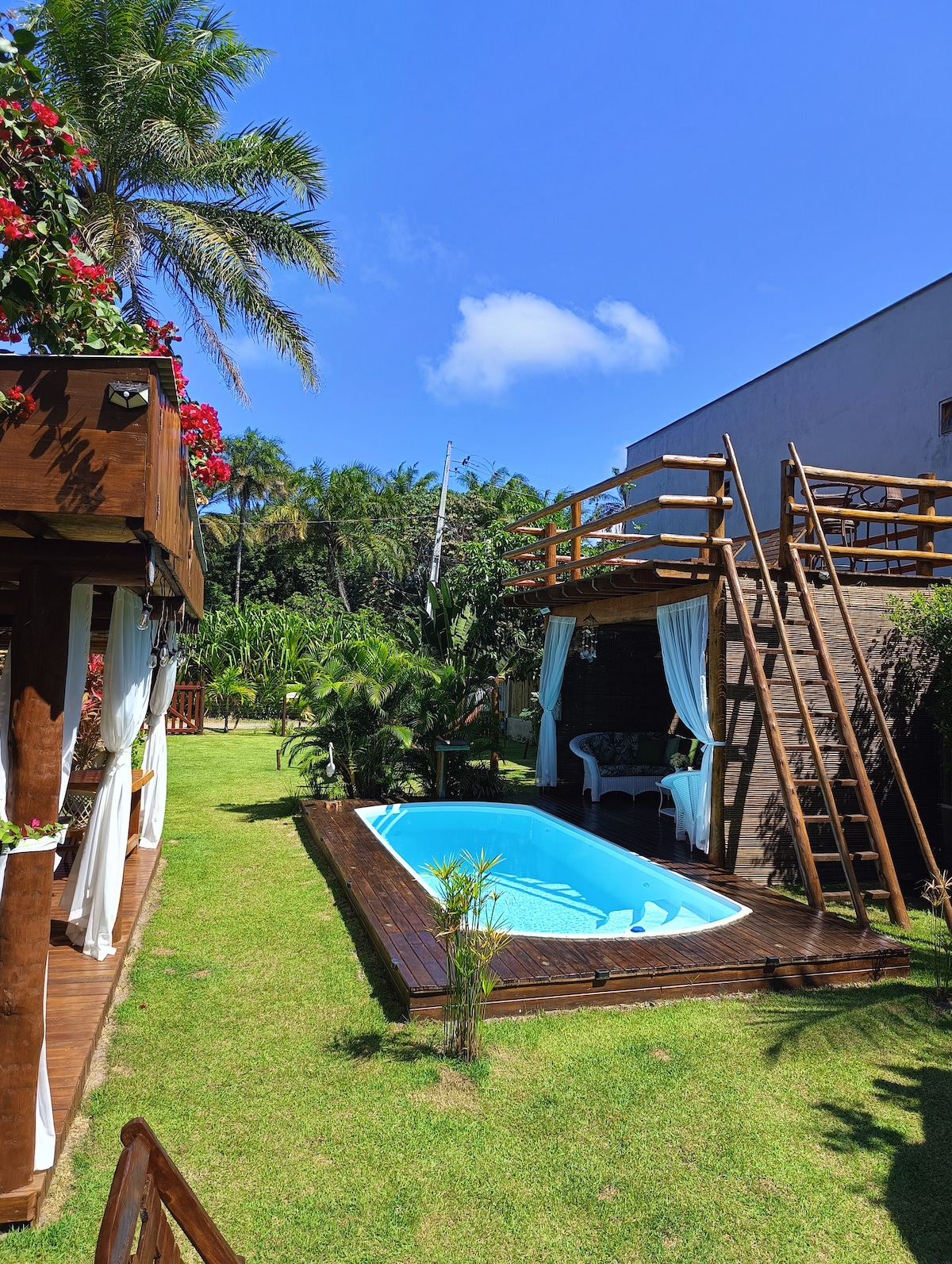 Uma suíte (quarto e banheiro) no 2.º piso da torre de água, com deck/varanda, rodeada de verde das árvores e luz do sol. Dispomos de cozinha externa para esse cômodo. Estamos situados no meio da Península de Maraú, com suas ondas, vastos coqueirais, areias finas e claras, lagoas e na maré baixa é um convite para desfrutar de suas piscinas naturais. Opção para a maioria dos boardsports aquáticos ou simplesmente ler e descansar na rede e sombra. O lugar perfeito para o ócio contemplativo.