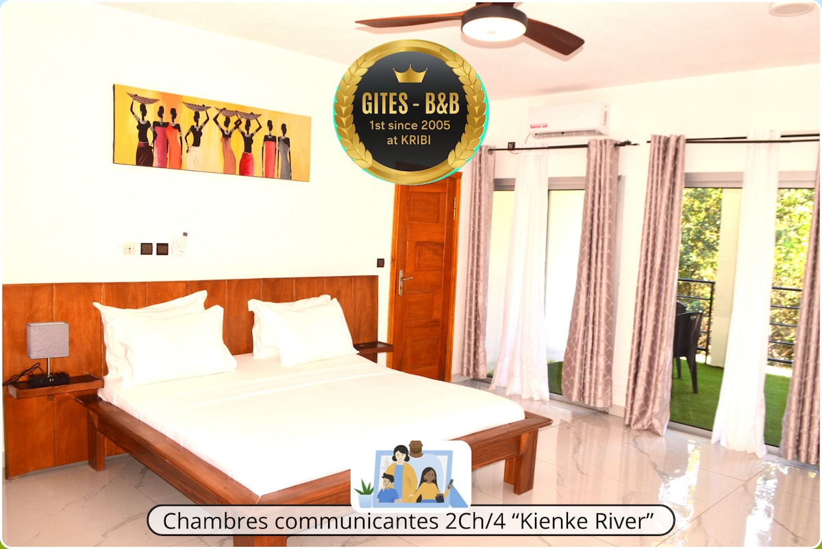 Chambres Communicantes – Lobé, Ntem, Kienje & Dja Idéales pour familles ou amis, nos chambres côte à côte reliées par une porte intérieure offrent confort et intimité à deux pas de la plage. Climatisées, équipées de lits doubles et simples, salle(s) de bain avec douche chaude, TV, Wi-Fi gratuit. Profitez de l’accès piscine, salle de sport et restaurant Au Plaisir du Goût. Un choix pratique et convivial au cœur de Kribi.