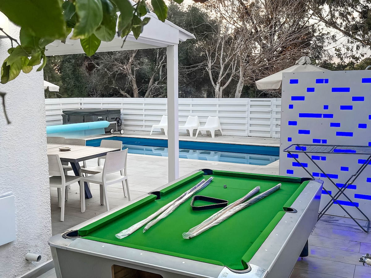 इस शांत जगह की खोज करें जहां भोग शांति से मिलता है। इस एस्टेट में इनडोर - आउटडोर लिविंग स्पेस, विशाल छतों, एक BBQ के साथ एक कवर किया हुआ आँगन डाइनिंग एरिया, एक बड़ा पूल और एक विशाल भूमध्यसागरीय बगीचा है। विला में बिलियर्ड्स और टेबल टेनिस भी है। अंत में ठहरने की एक और आलीशान और मज़ेदार कोठी के लिए भुगतान करके जकूज़ी और सॉना दिया जाता है। विला में पेंटिंग की एक प्रदर्शनी है। अगर आप कोई भी पेंटिंग खरीदने में रुचि रखते हैं, तो आप मेज़बानों से संपर्क कर सकते हैं।