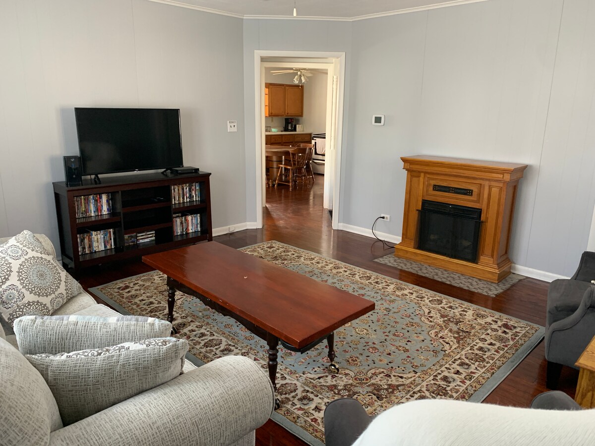 छोटे शहर के शांतिपूर्ण जीवन में आपका स्वागत है। शांत सड़क पर दो बेडरूम वाला बंगला। नए सिरे से रेनोवेट किया गया। पूरी तरह से सुसज्जित। मूल हार्डवुड फ़र्श, नया टाइल बाथ, किंग मास्टर, डेबेड/ट्रंडल सेकंड, लिविंग रूम में क्वीन सोफ़ा बेड। ताज़ा गैर - GMO अंडे और स्थानीय रूप से भुनी हुई कॉफ़ी से भरा बड़ा कंट्री किचन। प्रिंटर के साथ डेस्क। लिविंग रूम में Roku TV। वाईफ़ाई इंटरनेट। गैराज पार्किंग। टायर स्विंग के साथ विशाल यार्ड। सन पोर्च। पालतू जीवों का स्वागत है। साफ़ - सुथरा, आरामदेह, घर से दूर आपका घर बनने के लिए तैयार।