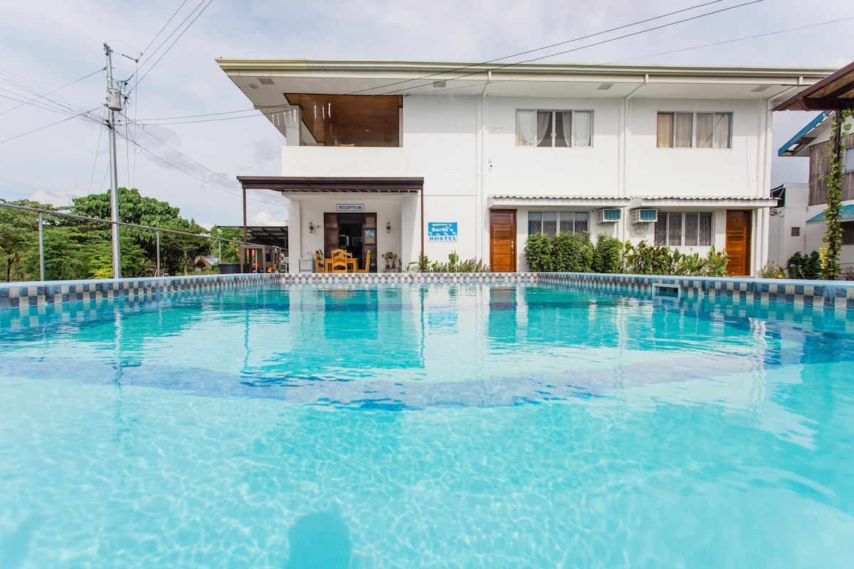 Private rooms with Private bathroom. This room is airconditioned with curtains for privacy. With 1 double bed good for 2 persons. You can also request for 2 twin beds instead. Just let us know in advance or prior to your arrival date. Inside each room, there's a cabinet, a dining table, a sink a bathroom mirror, and a water heater for the shower. You will also be provided with towels. Hot and cold water dispenser in the Reception Area. Free WIFI and pool access as well.