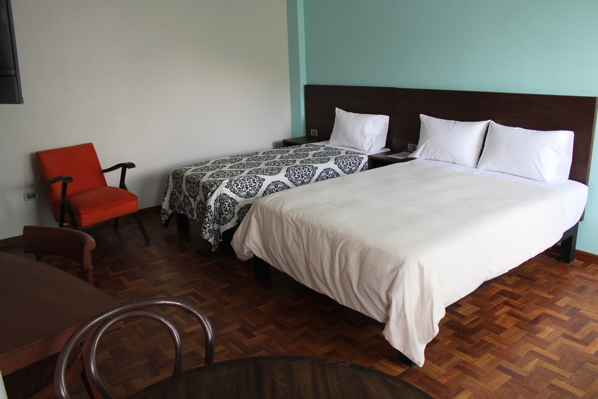 Nuestra Habitación Doble es el espacio perfecto para una estadía cómoda y relajante. Equipada con dos camas, una de dos plazas y otra de plaza y media, ofrece el balance ideal entre comodidad y funcionalidad. Disfruta de baño privado, Wi-Fi de alta velocidad y un ambiente moderno y acogedor. Perfecta para amigos o familias pequeñas que buscan confort en su viaje. ¡Te esperamos!
