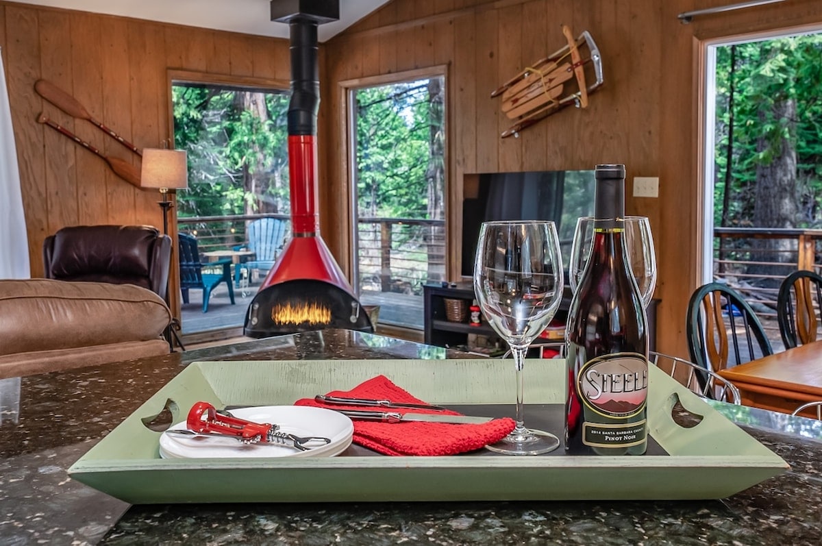 Most coveted Shaver Lake neighborhood! 10 min walk to Dorabelle Cove lake beaches & 5 min walk to Village restaurants & bars. Cozy fireplaces both in and outside & firewood provided. Central air/heat, high speed wifi & pet friendly. Soak in the peaceful wooded surroundings from the spacious deck and large windows. Renovated kitchen stocked with all cooking needs. Newer mattresses & linens. S'mores, sleds, floaties, beach chairs, umbrellas, sand toys provided. 19 miles to China Peak Ski Resort.