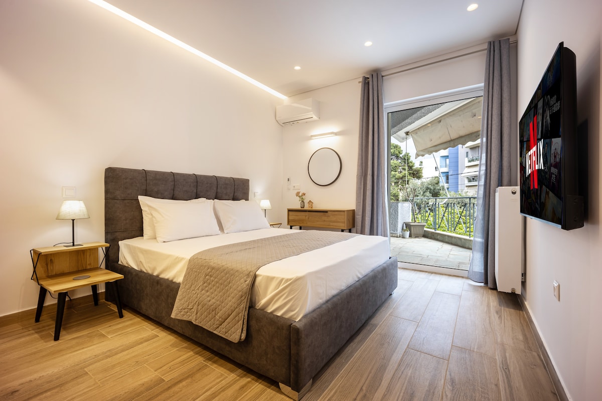 चमकीली जगहों वाला एक सुरुचिपूर्ण और खूबसूरत ग्राउंड फ़्लोर अपार्टमेंट, एक निजी बगीचा और एथेंस हाउस से अब उपलब्ध शहर के केंद्र तक आसान पहुँच! इसमें किचन, एक बेडरूम और एक आधुनिक बाथरूम वाला एक ओपन - प्लान लिविंग रूम है। हरे - भरे बगीचे में शांति है और यह आराम करने या बाहर खाने - पीने के लिए बिल्कुल सही है। आराम, व्यावहारिकता और प्रकृति के साथ संबंध की तलाश करने वालों के लिए बिल्कुल सही।