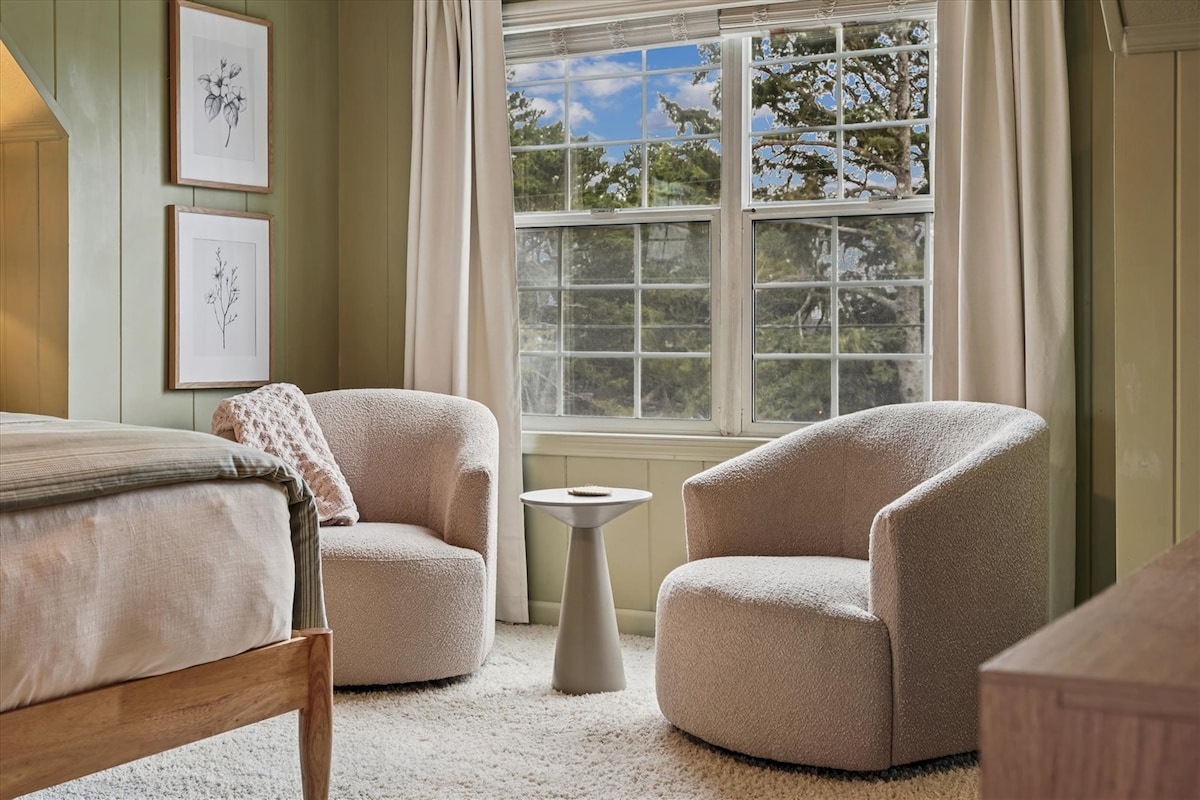 इस मेहमान सुइट में मुहाने और प्रशांत महासागर का नज़ारा है। डेक की कुर्सियों में से एक में डेक के बाहर एक कप कॉफ़ी के साथ बैठा हुआ है। एल्क के एक घूमने वाले झुंड के लिए गंजे ईगल। मुहाने में दो नदियाँ एक साथ आती हैं, ज्वार - भाटा को बाहर आते हुए देखना आकर्षक होता है। उच्च गुणवत्ता वाले लिनन आपकी यात्रा को और भी आरामदायक बना देंगे। लेव के लिए एक 50 amp सेवा। 2 इलेक्ट्रिक कार। फ़ार्म सैंक्चुअरी में किराए पर उपलब्ध चेक आउट सिस्टर्स। विवरण के लिए मुझसे पूछें। तालाब और बहनों के फ़ार्महाउस पर कॉटेज BIPOC और LGBTQIA+ दोस्ताना