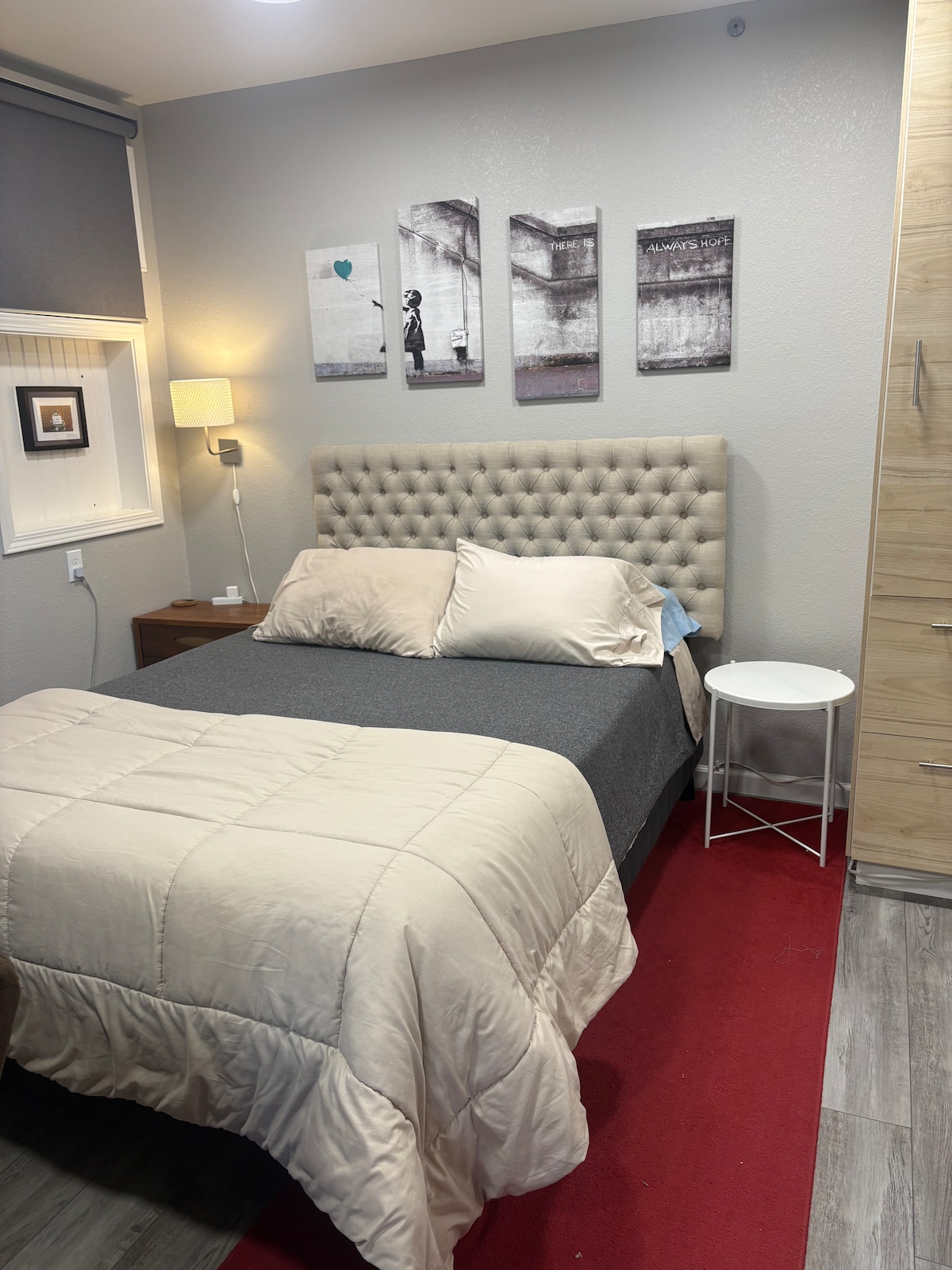 यह हमारी शानदार आधे एकड़ की लेकफ़्रंट, ट्री - स्टड प्रॉपर्टी पर गैराज से जुड़ा एक आरामदायक कमरा है। बेडरूम (डबल बेड) और बाथरूम काफ़ी छोटे हैं (ज़्यादा सामान रखने की जगह नहीं है), लेकिन कुछ रातों की बुकिंग के लिए बिल्कुल सही है। हमारे पास बाहर दो कुर्सियाँ और एक छोटी सी टेबल सेट अप है, और अन्य आरामदायक जगहें हैं। चेक इन का समय आमतौर पर 3:00 होता है, लेकिन पहले से मंज़ूरी लेकर ऐसा किया जा सकता है। हम मौके पर अपना घर भी किराए पर देते हैं। वे 2 अलग - अलग जगहें हैं, जो अटैच नहीं हैं।