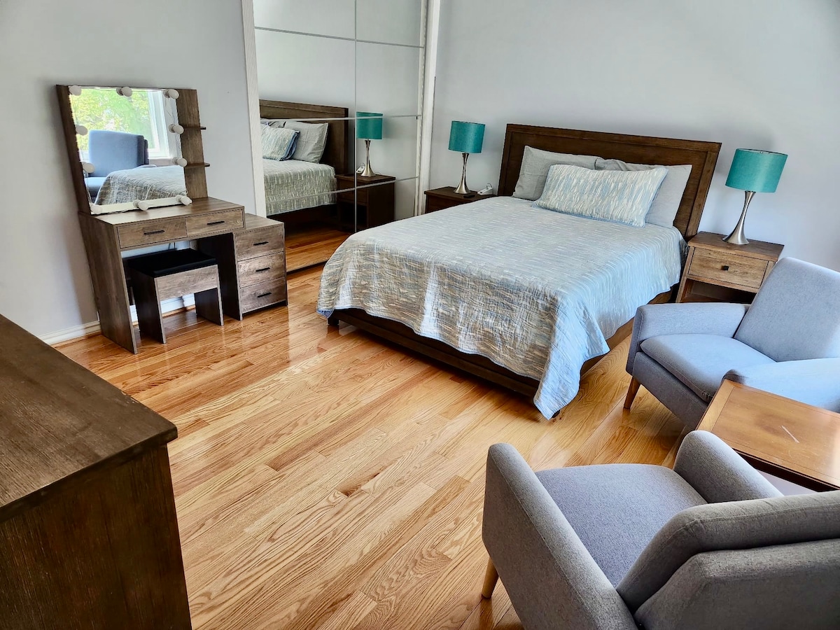 निजी बेडरूम (क्वीन बेड) के साथ निजी वॉकआउट बेसमेंट अपार्टमेंट; तीसरे मेहमान के लिए फ़ोल्डिंग ट्विन बेड, निजी फ़ुल बाथरूम; किचनेट में फ़्रिज, क्यूरिग कॉफ़ी मेकर, कुक-टॉप, बॉयलर, माइक्रोवेव और टोस्टर; टीवी (Netflix) और मुफ़्त वाईफ़ाई के साथ फ़ायरप्लेस वाला बड़ा लिविंग रूम। दो कुर्सियों वाली डाइनिंग टेबल। किचन के बुनियादी बर्तन और चांदी के बर्तन। काम करने की जगह : डेस्क, घूमने वाली कुर्सी। प्रवेश का रास्ता ढलान वाला है, जो चलने-फिरने में दिक्कत का सामना करने वाले मेहमानों के लिए मुश्किल हो सकता है।