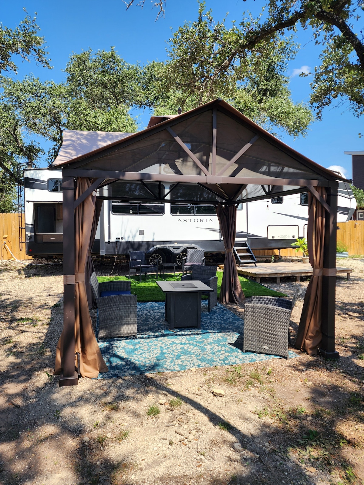 हमारे आराम, आनंदमय आरवी में आपका स्वागत है! यह शांत जगह कपल्स या सिंगल के लिए एकदम सही जगह है। हमारी निजी 4 एकड़ की प्रॉपर्टी पर स्थित, आपके पास आरामदायक ठहरने के लिए सभी बुनियादी सुविधाएँ हैं, जिसमें एक साझा BBQ क्षेत्र और एक ट्रीहाउस शामिल है! हम टेक्सास हिल कंट्री के केंद्र में हैं, व्हाइटवाटर एम्फ़ीथिएटर से केवल 5 मिनट की दूरी पर, घोड़े की नाल पर टयूबिंग, और न्यू ब्रौनफ़ेल्स के प्रसिद्ध श्लिटरबैन वॉटर पार्क से 25 मिनट की दूरी पर!