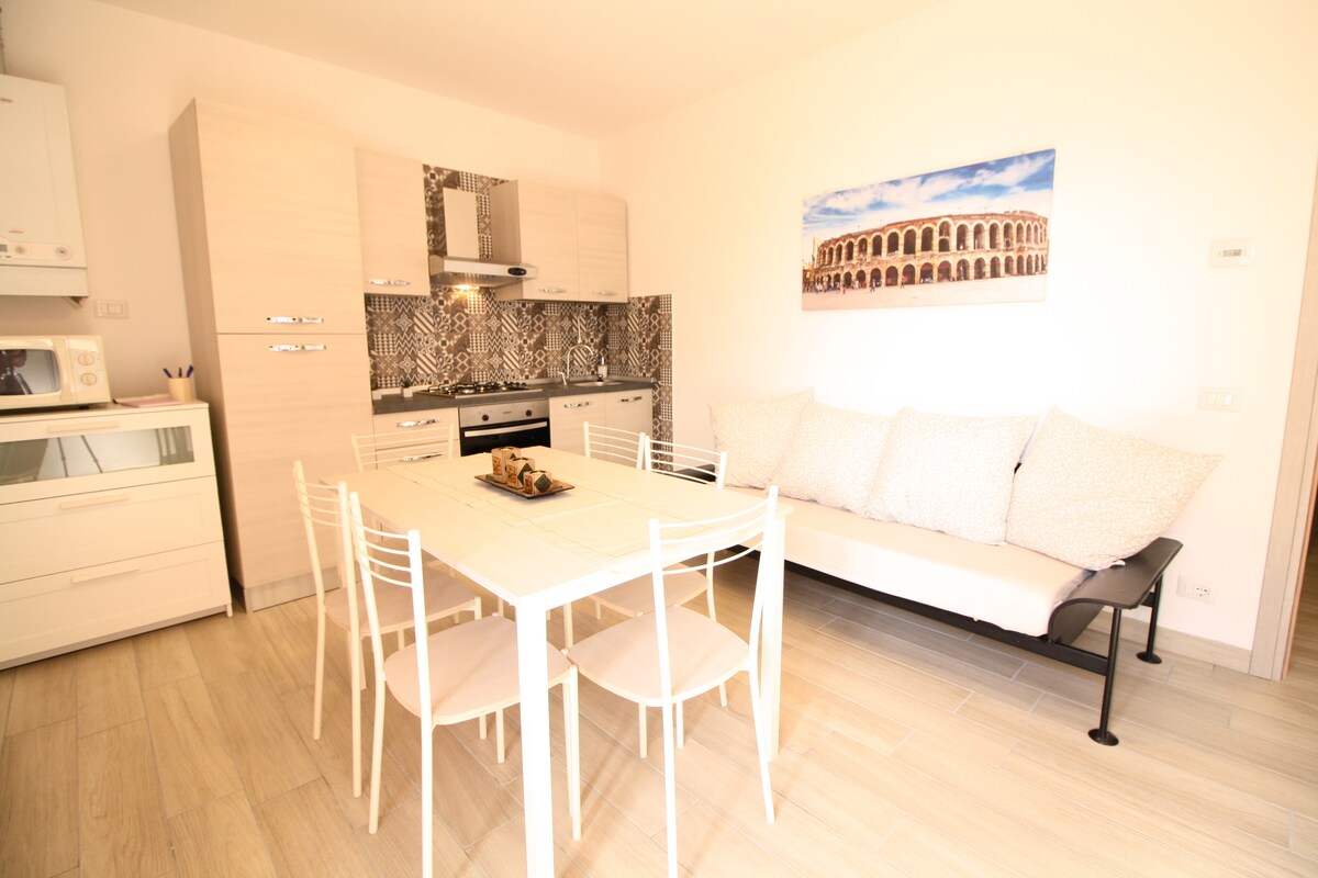"Residenza al Borgo" रोमांटिक वेरोना में आपका स्वागत करता है। हाल ही में पुनर्निर्मित अपार्टमेंट में, नए फर्नीचर के साथ, आराम या काम करने के लिए। आपको 4 लोगों को समायोजित करने के लिए डबल बेड और 1 बंक बेड वाला 1 बेडरूम मिलेगा। हर आराम और वाईफ़ाई के साथ सुसज्जित। वेरोना के इतिहास और चमत्कारों में खुद को विसर्जित करने से पहले आप छत पर आराम कर सकते हैं। अपार्टमेंट ऐतिहासिक केंद्र से लगभग 3 किमी दूर फिएरा डी वेरोना के पास स्थित है।