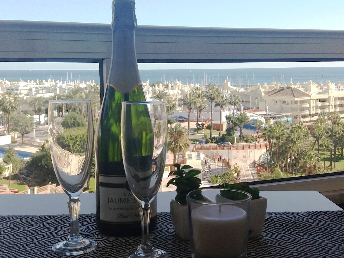 Cozy, bright, entirely renovated quality flat on the front line with sea views from the sunny and large balcony, both rooms and the bathroom. Features his and her shower, full kitchen, 2 tennis courts, 2 swimming pools (1 for children) large gardens, private beach area, free beach beds and private parking. We have a sandy beach with Blue Flag status and direct access to the sea boardwalk. Near Marbella and La Cala with 75+ restaurants and many shops walking distance. Strict cleaning.