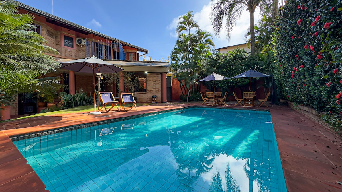 Leisure area located near Bonfim Paulista, Santa Marta lands! Ideal for up to 40 people during the day! With beer cooler, swimming pool, 4 bathrooms, 2 bedrooms with air conditioning. For overnight stays of up to 6 people, quiet place, well located with unique architecture! Fully air-conditioned, garden.