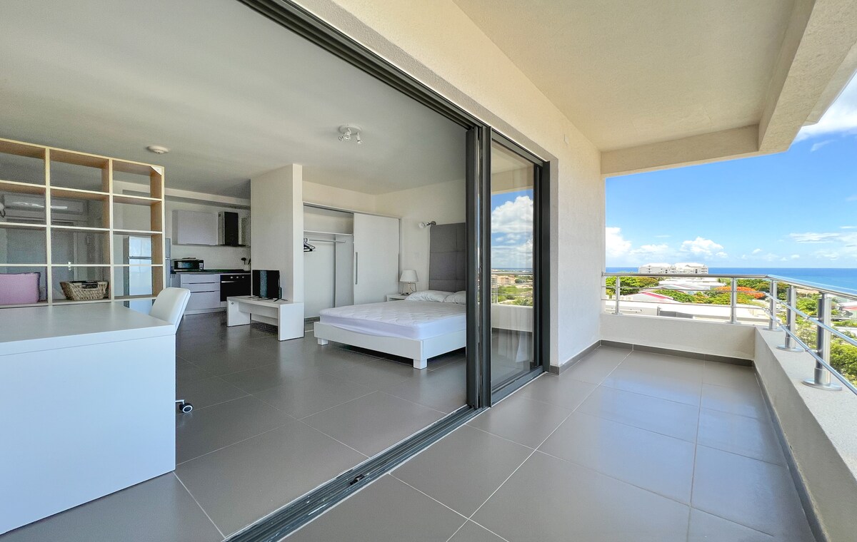 Welcome to paradise in this spacious and bright apartment, newly furnished with stunning sea views and indoor/outdoor dining. Relax by the pool, enjoy cocktails at the bar, and watch unforgettable sunsets from your private balcony. Features a plush king bed, equipped kitchen, AC, ceiling fans, 2 Smart TVs, and high-speed WiFi. Steps from Mullet Bay Beach, Maho, the airport, restaurants, and a supermarket just 3 minutes away. Free gated parking and laundry included, perfect for romantic escapes