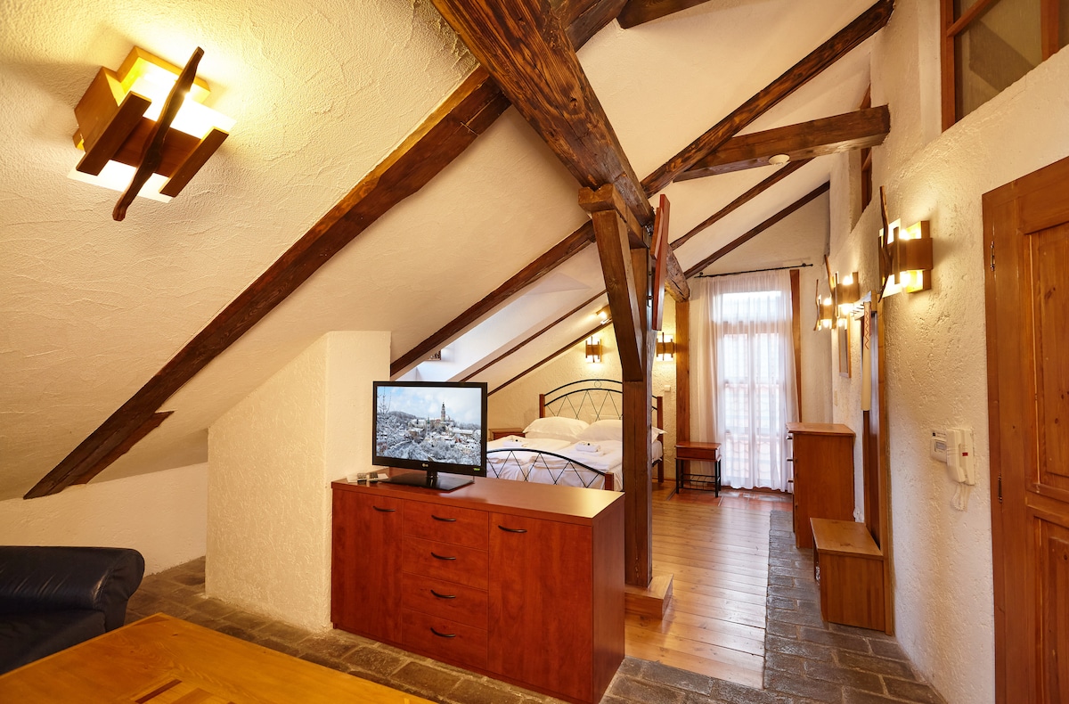 ─Мesk├╜ Krumlov рдХреЗ рдРрддрд┐рд╣рд╛рд╕рд┐рдХ рдХреЗрдВрджреНрд░ рдореЗрдВ рд╕реНрдерд┐рдд Moldavites si рдХрд╛ рдирд┐рд╡рд╛рд╕ рд╕рдВрдЧреНрд░рд╣рд╛рд▓рдпред рдЗрд╕ рджреЛ рдмреЗрдбрд░реВрдо рд╡рд╛рд▓реЗ рдЕрдкрд╛рд░реНрдЯрдореЗрдВрдЯ рдореЗрдВ рдЕрдиреНрдп рдЗрдорд╛рд░рддреЛрдВ, рдорд╣рд▓ рдФрд░ рдорд╣рд▓ рдЯреЙрд╡рд░ рдХреА рдЫрддреЛрдВ рдХрд╛ рд╕реБрдВрджрд░ рджреГрд╢реНрдп рд╣реИред рдХрд┐рд░рд╛рдП рдореЗрдВ рдореЛрд▓реНрдбрд╛рд╡рд╛рдЗрдЯ рдХреЗ рдЕрдиреЛрдЦреЗ рд╕рдВрдЧреНрд░рд╣рд╛рд▓рдп рдореЗрдВ рдкреНрд░рд╡реЗрд╢ рд╢рд╛рдорд┐рд▓ рд╣реИ