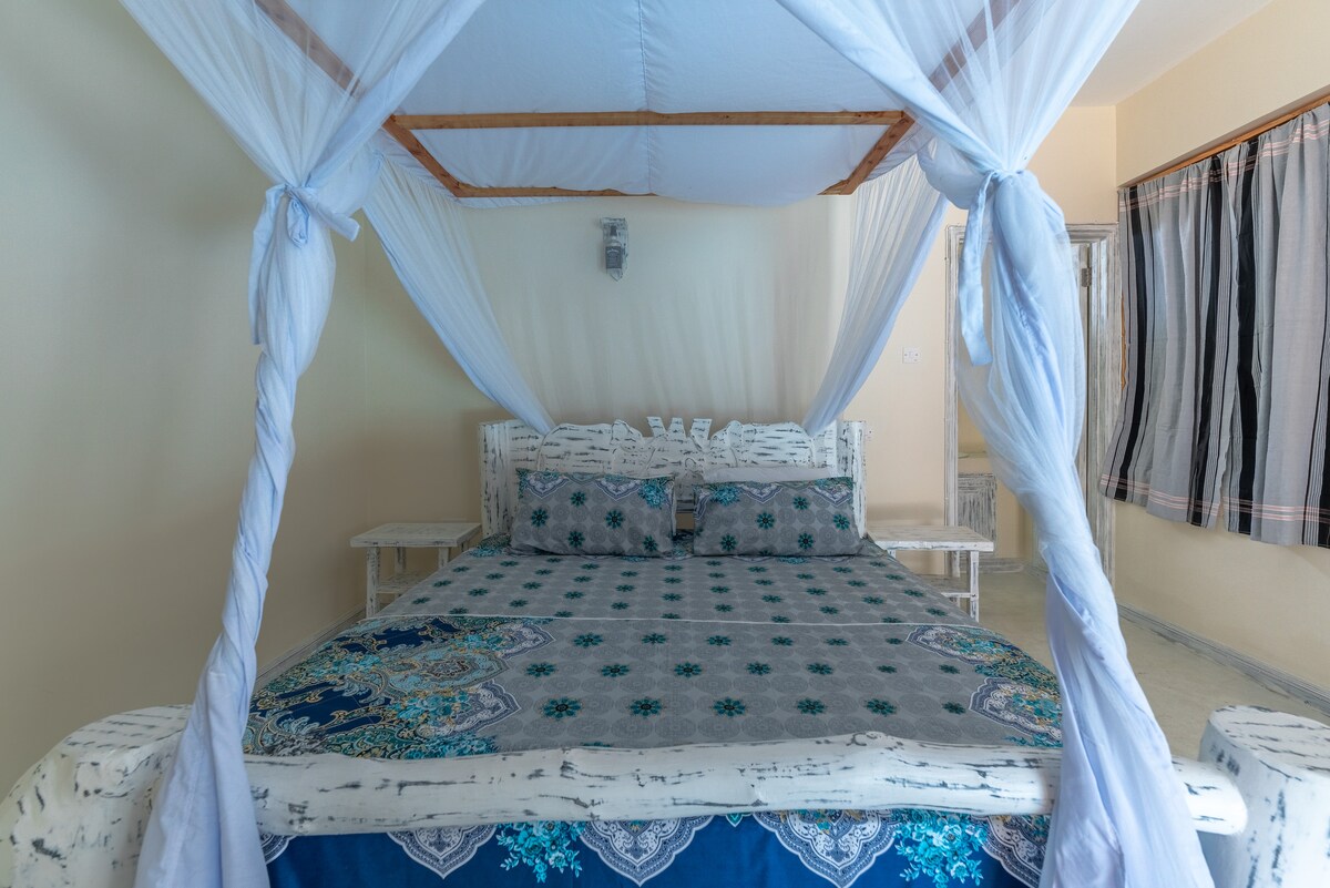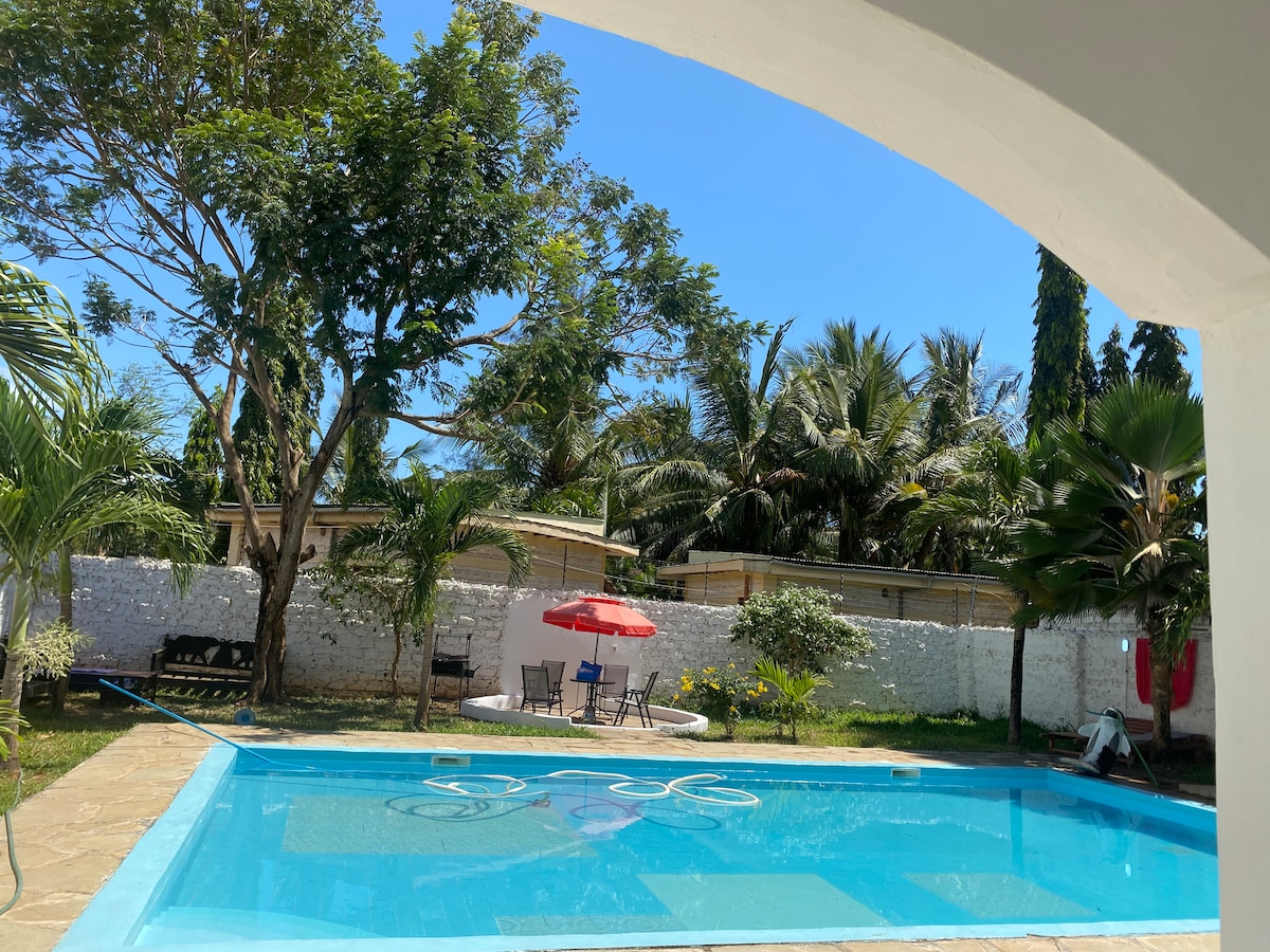 परिपक्व परिसर में एक बेडरूम वाला स्व - निहित गेस्ट हाउस, केन्या के सबसे खूबसूरत समुद्र तटों में से एक से केवल कुछ ही दूरी पर है। शॉपिंग सेंटर, हवाई पट्टी, गोल्फ कोर्स और अस्पताल से पांच मिनट। स्थानीय हवाई अड्डे से और मोम्बासा से मुफ़्त पिक - अप की लागत 6000 ks.local यात्राओं की व्यवस्था की जा सकती है और पुराने शहर और फ़ोर्ट जीसस को देखने के लिए मोम्बासा की यात्राएँ की जा सकती हैं। हमारे पास बगीचे में प्रसिद्ध लुप्तप्राय कोलोबस बंदर हैं। अधिकांश दोपहरों में हमारे पास एक ऊनी गर्दन वाला सारस होता है जो कभी - कभी पूल का दौरा करता है।