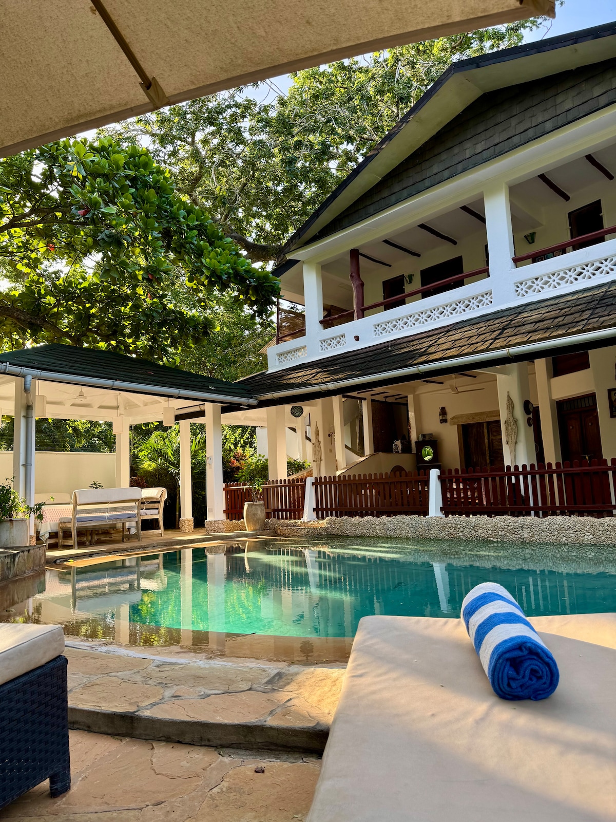 6/7 बेडरूम सुरक्षा के साथ शांत गेट वाली लेन में एक खूबसूरत आधे एकड़ के प्लॉट पर 2 घरों में फैले हुए हैं। अधिकतम 14 मेहमान सो सकते हैं। हमारे पास उत्कृष्ट कर्मचारी हैं, जो हमारी समीक्षाओं में लगातार सराहना करते हैं, दैनिक सफ़ाई और कपड़े धोने के साथ। बड़े, निजी पूल की देखभाल माली करता है। किराए में मुफ़्त वाईफ़ाई, सफ़ाई और लॉन्ड्री की सुविधा शामिल है। शेफ़ अनुरोध पर उपलब्ध है। शानदार सफ़ेद रेत का बीच 9 मिनट की पैदल दूरी पर है। हमारी मेहमानों की समीक्षाएँ पढ़ें, वे आपको वह सब बताती हैं, जो आपको जानना ज़रूरी है और संडे एक्सप्रेस लेख (फ़ोटो देखें)।