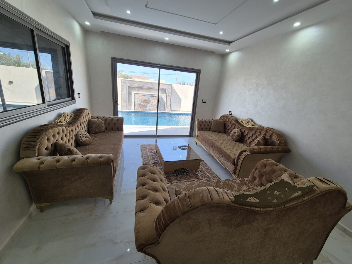 Bienvenue dans notre villa sans vis-à-vis exposée plein sud, dans un endroit calme Elle dispose d'une grande piscine privée, d'une pataugeoire, d'un grand séjour, d'une cuisine équipée, d'un coin pergola pour des moments de détente, d'un barbecue, d'un coin cosy... Des jeux de société sont disponibles pour vous divertir À 200 m de la mosquée, et en voiture : à 2 min de la supérette, à 5 min de la plage et à 15 min du centre-ville de Midoun et de Bourgo Mall La voiture est fortement conseillée