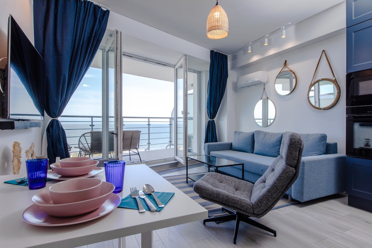 कम्फ़र्ट लाइन 4 - बेड वाला अपार्टमेंट, जो पूरी तरह से समुद्र से सुसज्जित है। अपार्टमेंट का सबसे बड़ा फ़ायदा 30 मीटर की छत है, जो समुद्र और शहर की स्काईलाइन को देखती है। इमारत समुद्र तट के वंश से 20 मीटर की दूरी पर है। अपार्टमेंट के किराए में एक बंद गैराज हॉल में पार्किंग की जगह और मुफ़्त वाईफ़ाई शामिल है। अपार्टमेंट में एक बेडरूम और एक रसोईघर के साथ एक लिविंग रूम है।