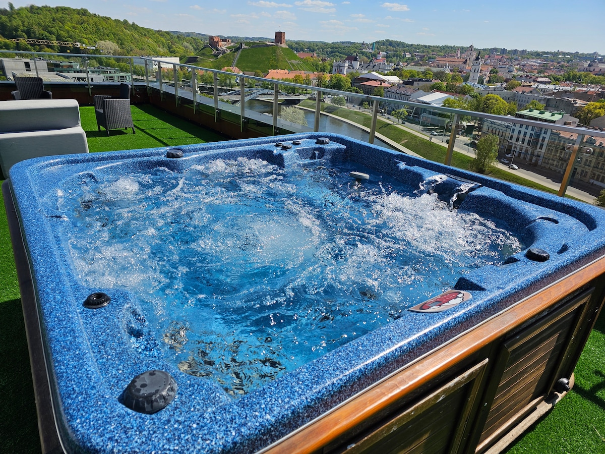 गगनचुंबी इमारत की ऊपरी मंज़िल में, ओल्ड टाउन के पास स्थित विल्नियस में एक शानदार पेंटहाउस, एक शानदार बिज़नेस क्लास अपार्टमेंट विल्नियस के इतिहास पर मनोरम दृश्यों का आनंद लेता है। अपार्टमेंट ओल्ड टाउन से बस 10 मिनट की पैदल दूरी पर है। शानदार फ़्लोर - टू - छत शोकेस खिड़कियाँ हैं जो आपको विल्नियस के सबसे मूल्यवान दृश्य प्रदान करती हैं। आराम से आराम करने के लिए एक बड़े डबल बेड के साथ एक बहुत ही आरामदायक, उदार बेडरूम है। इस अपार्टमेंट में एक बड़ा चौड़ा टीवी और पुस्तकालय भी है।