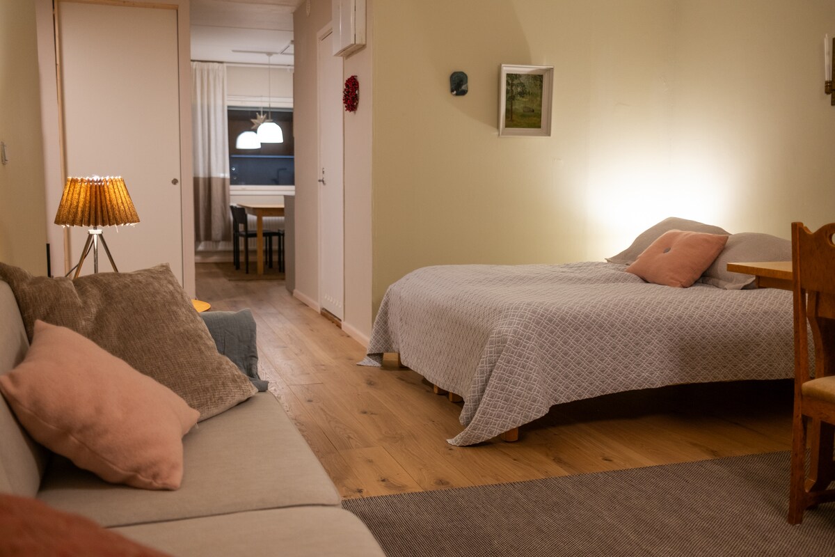 शहर की हलचल से दूर एक शांत छोटे से घर के इलाके में स्टूडियो। हेलसिंकी - वंटा हवाई अड्डे के पास, अच्छे सार्वजनिक परिवहन कनेक्शन, मुफ़्त पार्किंग। 33 वर्ग मीटर का स्टूडियो अपार्टमेंट, जिसका अपना प्रवेशद्वार है। 2020 में पूरी तरह से पुनर्निर्मित। एयर - सोर्स हीट पंप गर्मियों में अपार्टमेंट को ठंडा और सर्दियों में गर्म रखता है। तेमपुर गद्दे के साथ 160 सेमी डबल बेड, 140 सेमी सोफ़ा बेड, ज़रूरत पड़ने पर बच्चों का ट्रैवल बेड।