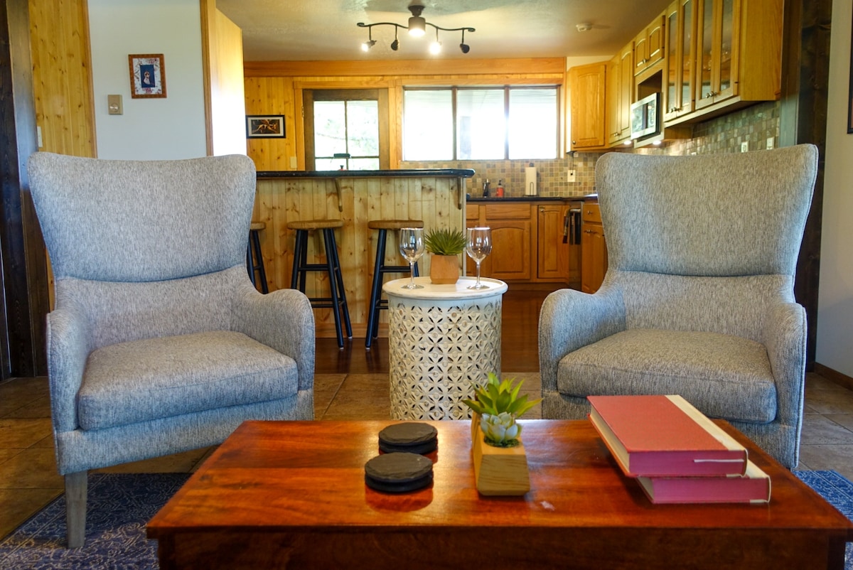 Come ski Breckenridge! 5 minutes from down town & free skier parking for Breckenridge ski resort! Cute studio-like space in a house on 2 acres with incredible Rocky Mountain views from hot tub. Shared access to decks, hot tub & outdoor grill. Please look at pictures for details of space. Private bedroom & bathroom, double bed, sitting area, and hallway wet bar. Private parking and access. Enjoy 100+ restaurants & bars, dog sledding, snow mobiling, snow shoeing, x country. DOGS STAY FREE.