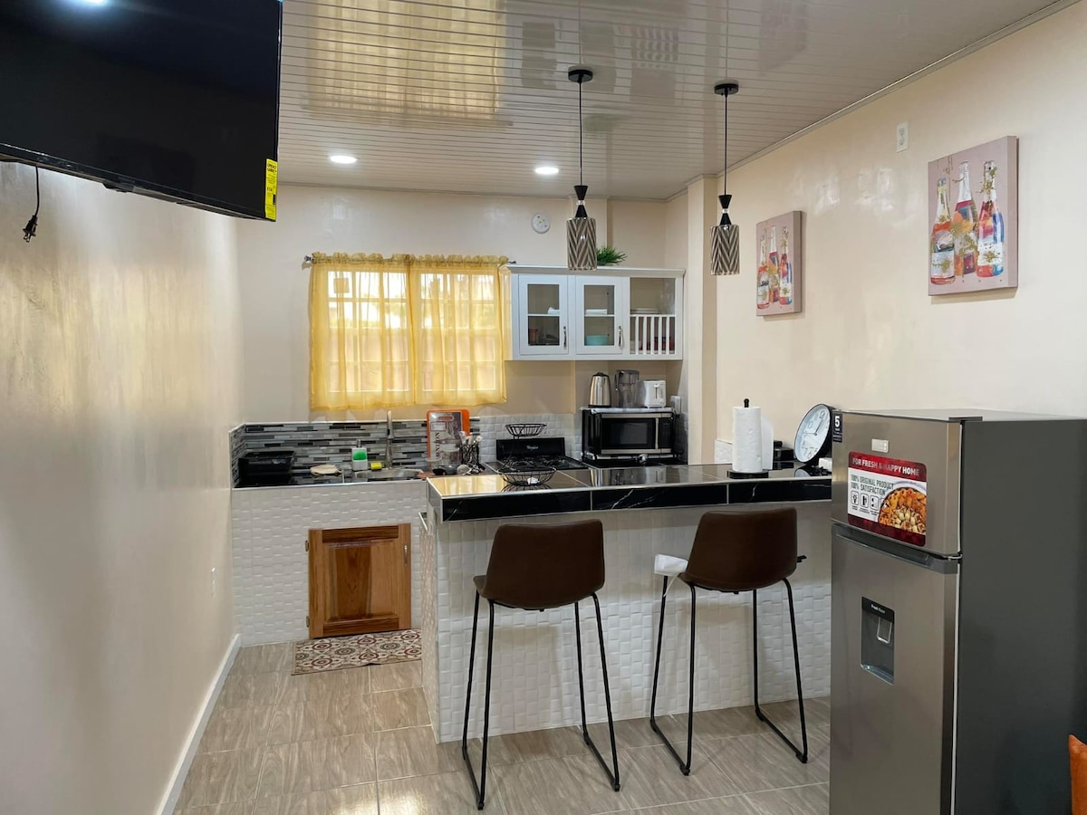 घर से दूर घर। शैली और आराम में गुयाना की सुंदरता। आधुनिक पूरी तरह से सुसज्जित 2 - बेडरूम का अपार्टमेंट। स्नानघर से जुड़ा अर्ध मास्टर bdrm। रेफ्रिजरेटर, माइक्रोवेव, स्टोव, केतली के साथ रसोई। दो क्वीन साइज़ बेड। सुरुचिपूर्ण बाथरूम। गर्म/ठंडा पानी। पूरी तरह से वातानुकूलित। सभी खिड़कियों और दरवाजों पर सुरक्षा द्वार। वाईफ़ाई। प्रोविडेंस, ईस्ट बैंक डेमरारा की विकासशील Remigrant योजना में स्थित है। नेशनल स्टेडियम, Amazonia मॉल, स्टारबक्स, जिम, रमादा होटल, जॉर्जटाउन से मिनट की दूरी पर।