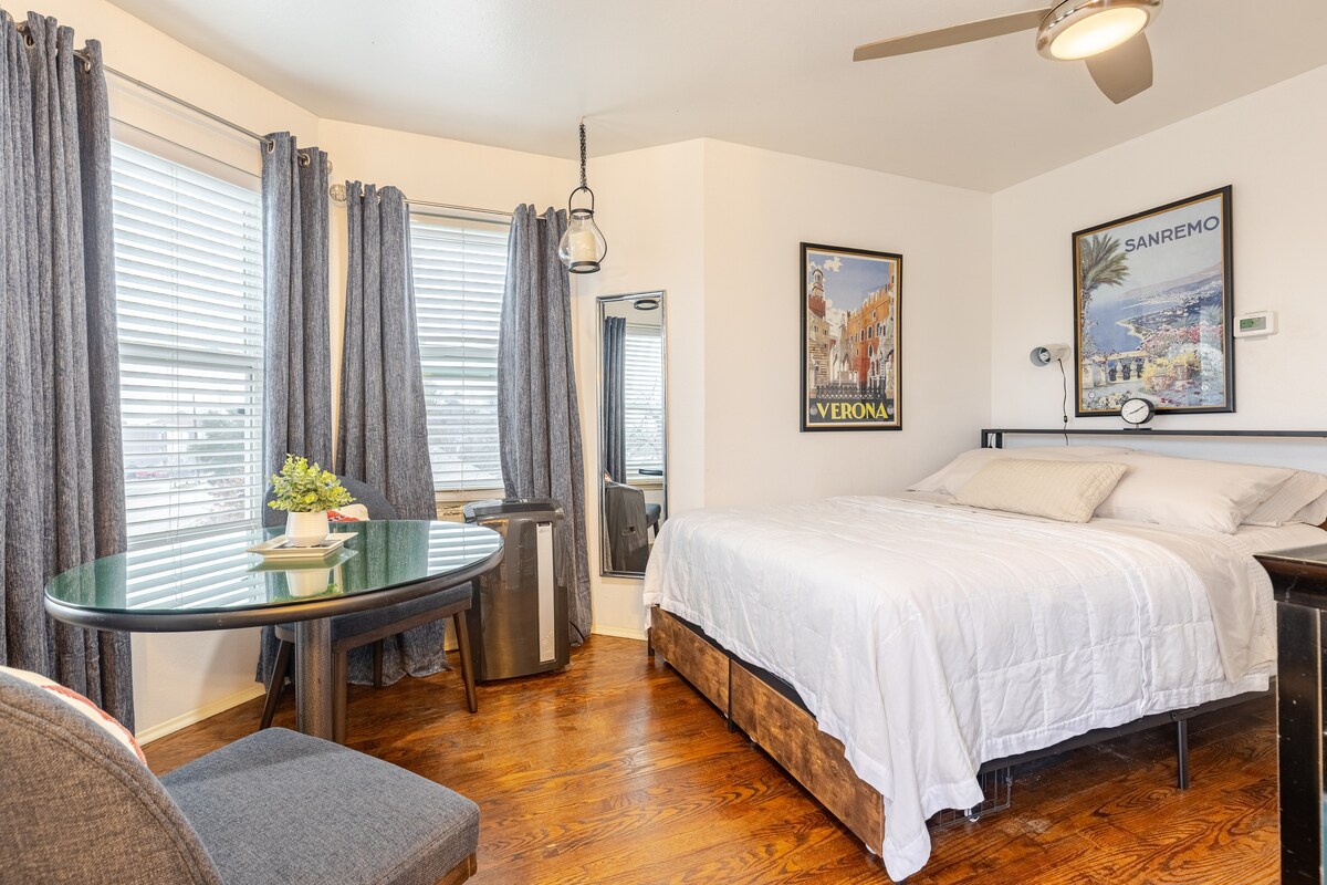 नए सिरे से रेनोवेट किया गया! यह कॉन्डो एक शांत बिल्डिंग में है, जहाँ पार्किंग की जगह असाइन की गई है। आँगन से सड़क के उस पार मौजूद ऐतिहासिक घरों में मौजूद रेस्टोरेंट देखें। BBQ, पिज़्ज़ा, थाई और शाकाहारी व्यंजनों की सेवा करने वाली मज़ेदार दुकानों और अनोखे रेस्तरां तक पैदल चलें। अगर आप खाना बनाना पसंद करते हैं, तो किराने की दुकान बस एक ब्लॉक की दूरी पर है। टेक्सास विश्वविद्यालय में एक गेम या संगीत कार्यक्रम देखें! ऑस्टिन शहर के आस - पास की जगहों का मज़ा लें। सोफ़ा तीसरे मेहमान के लिए ट्विन बेड में बदल जाता है। साइट पर लॉन्ड्री की सुविधा। मुफ़्त वाई - फ़ाई!