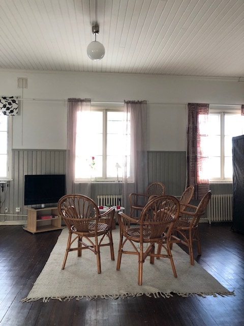 1949 में बना यह घर एक शांत इलाके में है। सुबह की धूप और पानी के नज़ारे के साथ बरामदा। बड़ा आंगन। सभी आवश्यक सामानों, चीनी मिट्टी के बरतन, किताबों के साथ घर की तरह सजावट की गई है, इसके अलावा एक सौना भी है। हमें अपने घर में रहना पसंद है और हम इसे साझा करना चाहते हैं।