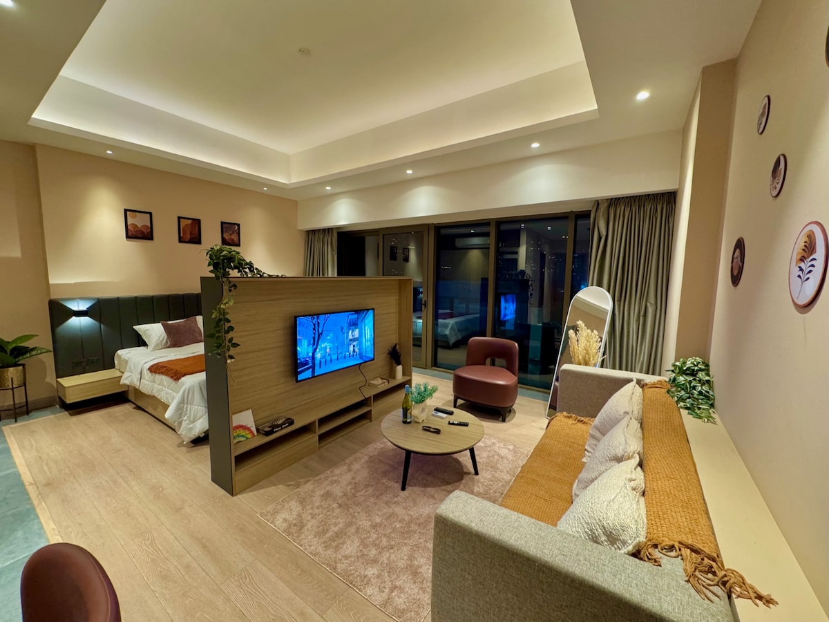 Experience comfort and style in a sanctuary designed for work and relaxation. Rest on a Wakefit orthopedic mattress and enjoy warm ambient lighting. Stay productive with an ergonomic workspace and unwind with two 42-inch TVs. The attached bathroom offers premium toiletries and a lit vanity mirror. Cook effortlessly in a fully equipped kitchen. Relax on the sofa in a space where peace, productivity, and lifestyle blend perfectly.