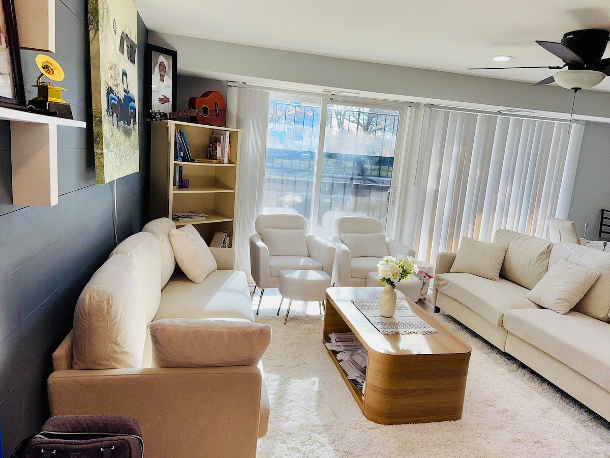 एक सुपर आरामदायक एल - आकार के अनुभागीय सोफे के साथ सुंदर, आरामदायक, धूप वाला कमरा। डिशवॉशर, स्टोव, ओवन, माइक्रोवेव, नियमित और के - कप कॉफी निर्माताओं, माइक्रो - वेव, टोस्टर, बर्तन, पैन, बर्तन, बर्तन, बर्तन और Silverware के साथ सुपर क्लीन और विशाल पूरी तरह से सुसज्जित ईट - इन किचन। अपार्टमेंट में (2) 43" फ्लैट स्क्रीन टीवी; स्ट्रीमिंग HULU - Live, Amazon Prime, Disney Plus शामिल हैं। इसके अलावा, एक छोटे से कार्य डेस्क क्षेत्र ने मुफ्त वॉशर/ड्रायर का उपयोग और मुफ्त पार्किंग, (अल्पकालिक पट्टा उपलब्ध) प्रदान किया।