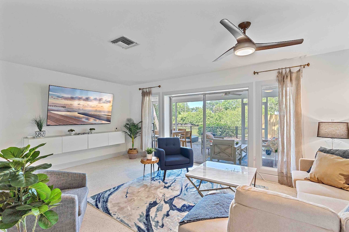 Enjoy this incredibly cozy home just minutes from Siesta key. Situated on a private lagoon making for an exceptional view. Take the view in through the large screened in porch w/ plenty of seating & dining space for larger groups. Enjoy 3 traditional bedrooms, 1 with w/ a primary bedroom boasting a walk in closet, en-suite, & a custom vaulted cedar ceiling. Each room has its own large smart tv. A 4th bedroom/office, with a single bed, for larger groups. Enjoy an oversized lving room w/ a 75” TV!