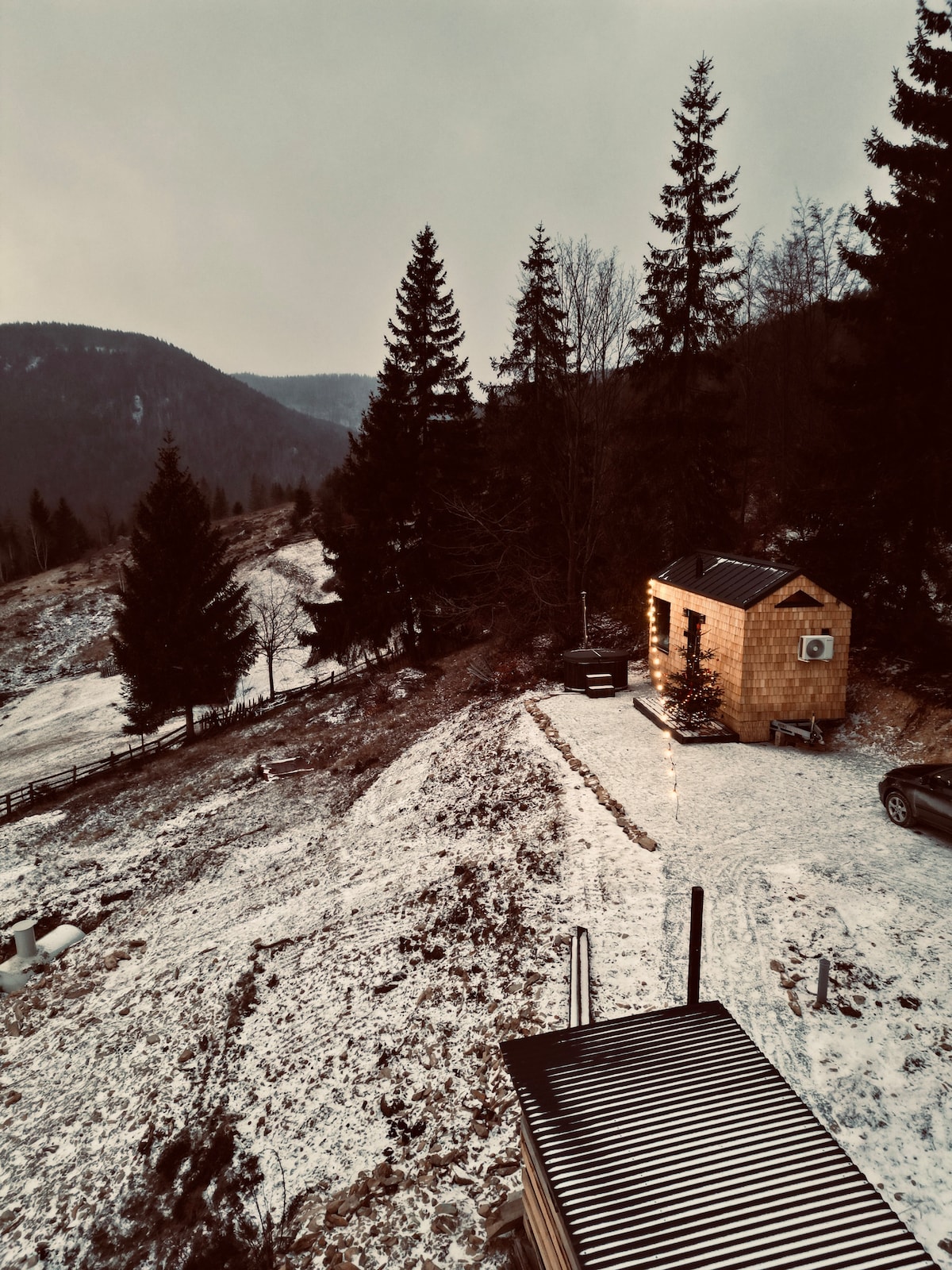 A hidden 18 m┬▓ tiny house wrapped in acacia shingles, nestled deep in the Apuseni Mountains. Perfect for couples or small families, it features a fully equipped kitchen, modern bathroom, a large double bed with panoramic mountain views, and a private hot tub for two. A quiet escape where nature meets comfort.