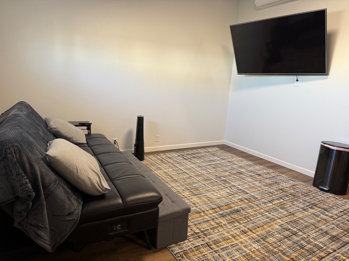 Enjoy a clean, modern 1-bedroom space designed for comfort and convenience. The bedroom features a cozy bed, while the living area includes a sofa that converts into an additional bed and a wall-mounted TV. The unit offers a fully equipped kitchen with modern cabinetry, refrigerator, cooktop, sink, and coffee maker. YouтАЩll also have two full bathrooms with walk-in tiled showers, plus an in-unit washer and dryer. Perfect for couples, small groups, come by for a comfortable stay!