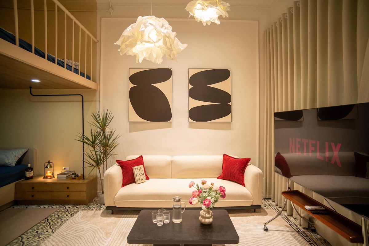 The apartment just opened in June 2025. It is meticulously designed in a mid-century style blended with Vietnamese cultural elements. Most importantly, it’s located right in Hoan Kiem District—just a 5-minute walk to the famous Train Street coffee check-in spot and another 5 minutes to Hanoi’s Old Quarter. Enjoy a stylish experience at this centrally-located place.