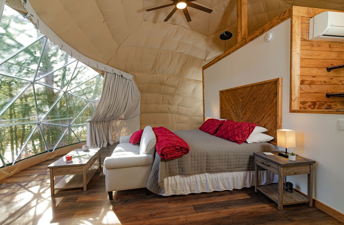 Our geodomes are the first in the U.S. to feature indoor plumbing, HVAC, and electricity! With a blend of contemporary style and comfort, they include exposed metal piping, butcher block shelving, and pebble shower floors. Inside, you'll find a king-size bed, a table for two, and a cozy seating area facing a large window. The kitchenette is equipped with retro-style appliances. Blissfully free of televisions, you can fully unwind in nature’s tranquility, enjoying the changing seasonal views.