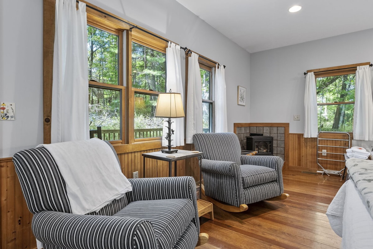 The Dogwood Cabin offers flexibility and charm, with a spacious downstairs bedroom and a Murphy bed in the living room, making it perfect for either a couple’s escape or a friends retreat. Unique touches, like a hand-painted mural just outside the bedroom deck, create a truly one-of-a-kind experience. Enjoy two private porches and large glass doors for endless views. Amenities include a two-person soaking tub, generous living space, and a fully equipped kitchen—all you need for a memorable stay.