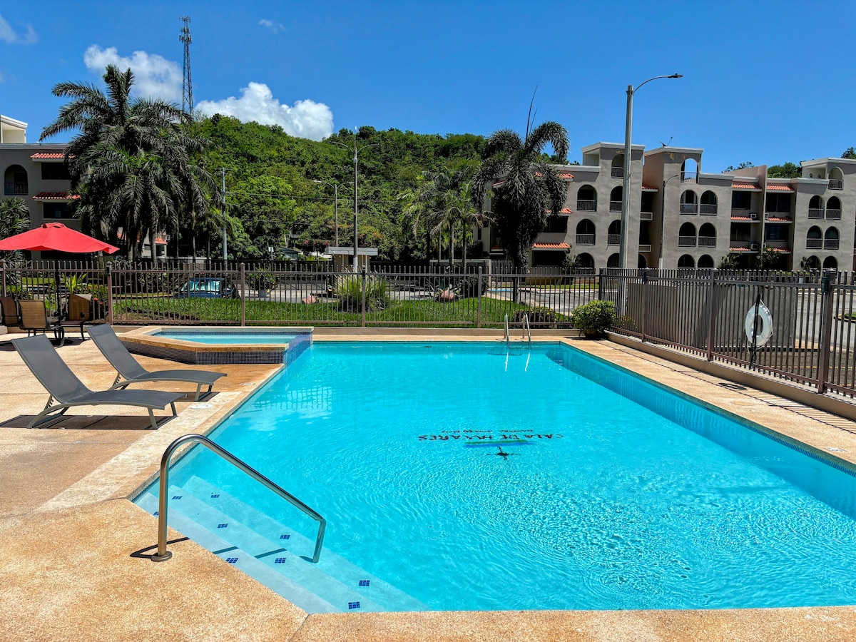 Relájate en familia en este hermoso y cómodo apartamento. Lugar tranquilo a pasos de la playa y del turístico Malecón de Naguabo. El complejo cuenta con áreas comunes como: piscina, canchas de tennis, baloncesto, voleyball playero y columpios. Cerca del Yunque, Carabalí Rainforest park, Playa 7Seas, Reserva Natural de Humacao, Terminal de lanchas para Vieques y Culebras, entre otros.