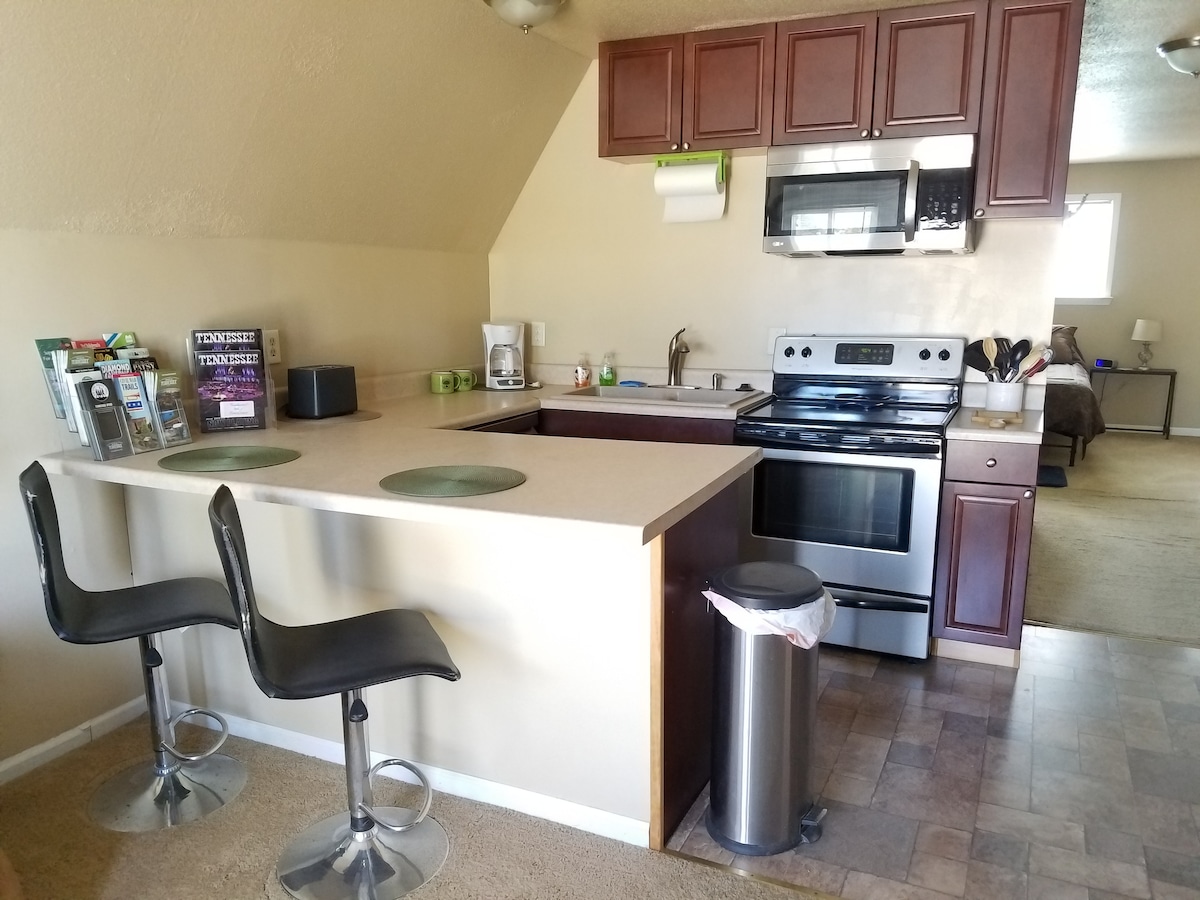 हेंडरसन में 5 वें पर स्टूडियो, टीएन फ्रीड - हरमन विश्वविद्यालय (3/4 मील) और जैक्सन से 25 मिनट के करीब है। यह स्टूडियो w/ 1 क्वीन साइज़ बेड, 1 बाथ और किचन गेस्टहाउस कपल्स और अकेले एडवेंचरर के लिए अच्छा है। यह मेज़बान के पारिवारिक घर के बगल में एक शांत पड़ोस में स्थित है। इसमें शामिल हैं: ऑफ़ - स्ट्रीट पार्किंग, पूरक कॉफ़ी और स्नैक्स, वाई - फ़ाई, साबुन, शैम्पू, ताज़े तौलिए और चादरें और आउटडोर सीटिंग। **सरल चेक इन और चेक आउट! कोई "करने के लिए" लिस्ट नहीं !** ** 6 साल से भी ज़्यादा समय से सुपर मेज़बान !**
