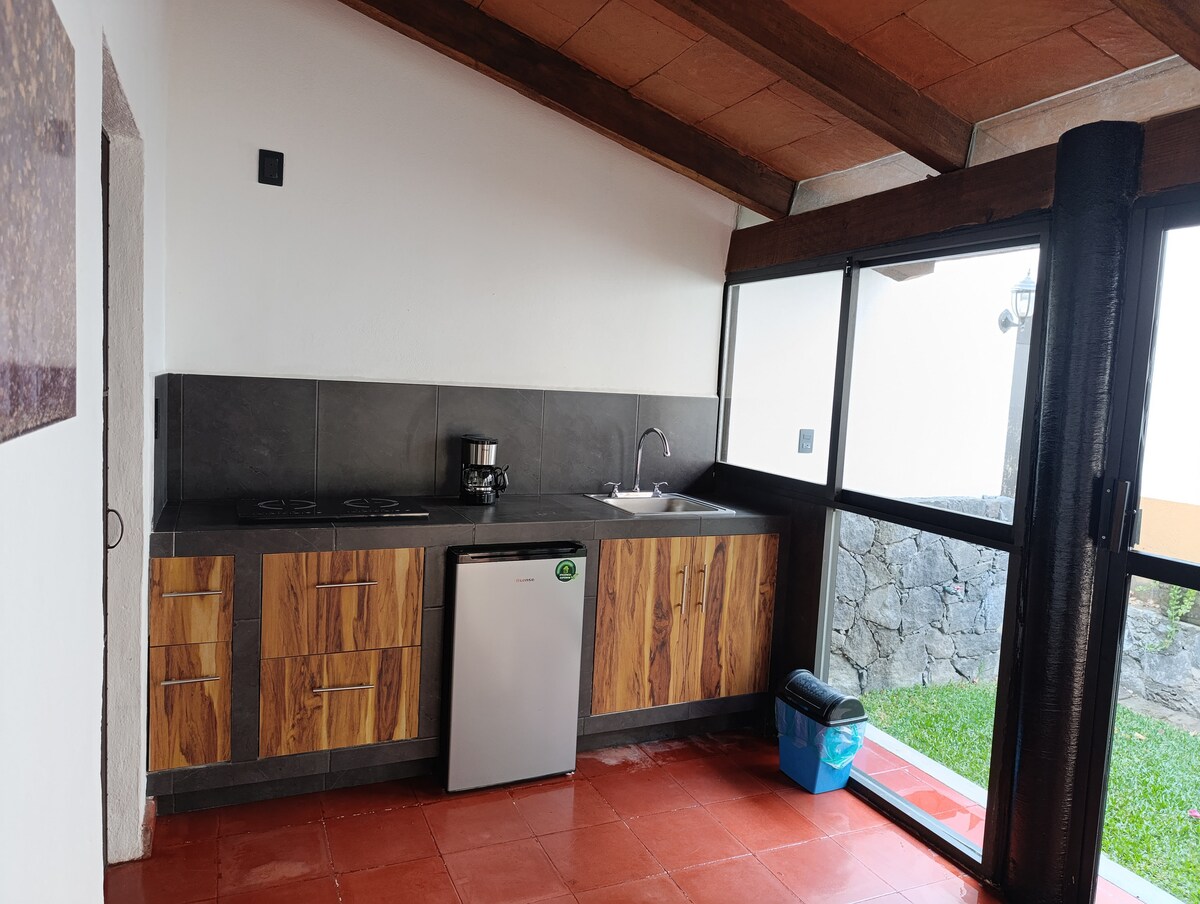 प्रकृति से घिरा हमारा केबिन डिस्कनेक्ट करने और आराम करने के लिए आदर्श है। सूर्यास्त और डेक से प्यारा दृश्य देखने के लिए एक गिलास वाइन का आनंद लें। यह आपको हर दिन बाहर निकलने के लिए आमंत्रित करता है, इसलिए कोई टीवी नहीं है। कॉटेज बाथरूम और सुसज्जित रसोई, वाईफाई, वर्कस्टेशन और पार्किंग के साथ निजी है। आम क्षेत्रों (जकूज़ी और उद्यान) को 2 व्यक्ति कुटीर के साथ साझा किया जाता है। Tepoztlán केंद्र से 6 किमी (15 मिनट)।
