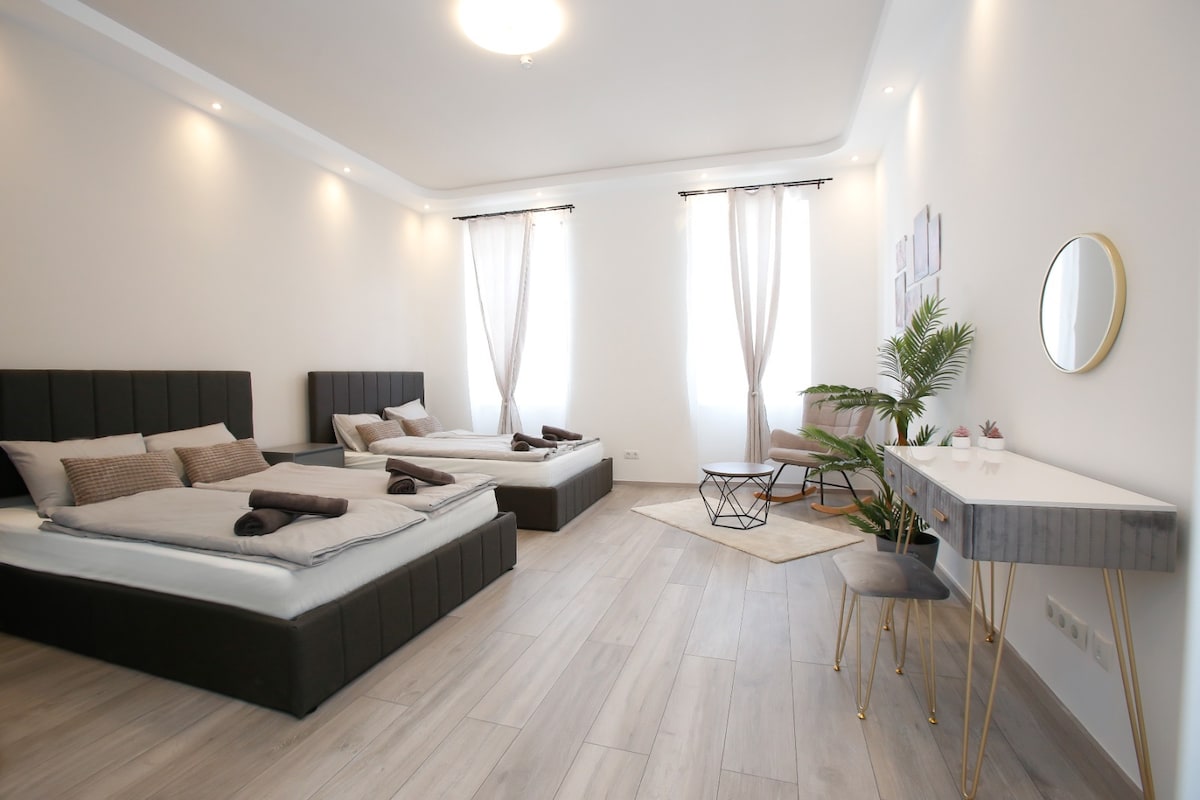 अपने परफेक्ट सिटी रिट्रीट में आपका स्वागत है! 130 वर्ग मीटर का यह विशाल फ़्लैट आराम और शैली दोनों के लिए डिज़ाइन किया गया है, जिसमें 3 आरामदायक बेडरूम (2 अलग - अलग कमरे और 1 वॉक - थ्रू रूम), 2 आधुनिक बाथरूम और एक उदार 50 वर्ग मीटर का लिविंग और किचन एरिया है। दो आकर्षक छतों से रीसेनराड और डेन्यूब चैनल के शानदार नज़ारों का मज़ा लें। चाहे आप आराम कर रहे हों या खोजबीन कर रहे हों, यह अनोखा नखलिस्तान शहर के बीचों - बीच एक शांतिपूर्ण पलायन की सुविधा देता है।