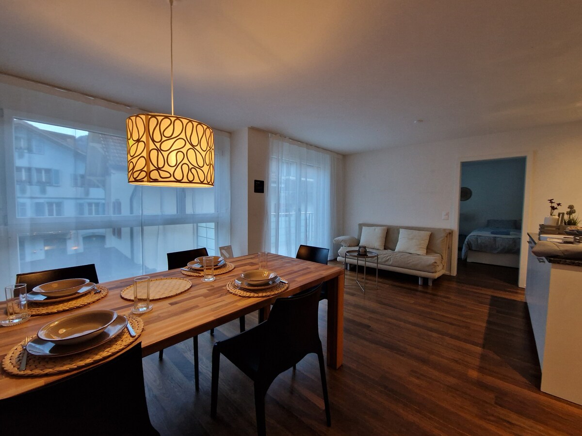 इंटरलेकन के बिल्कुल बीच में मौजूद सेंट्रल और मॉडर्न अपार्टमेंट, जिसमें एक छत है, जो इंटरलेकन और जंगफ़्राउ पर्वत के शानदार नज़ारों की पेशकश करती है, यह नवनिर्मित अपार्टमेंट इस क्षेत्र में आपके ठहरने के लिए एकदम सही है। हमारे अपार्टमेंट में 3 बेडरूम, 2 बाथरूम, एक पूरी तरह से सुसज्जित किचन, एक विशाल और आधुनिक लिविंग रूम/डाइनिंग एरिया और एक बड़ी छत है। यह छोटी और लंबी बुकिंग दोनों के लिए और इंटरलेकन के साथ - साथ जंगफ़्राऊ क्षेत्र की सैर करने के लिए एकदम सही है।